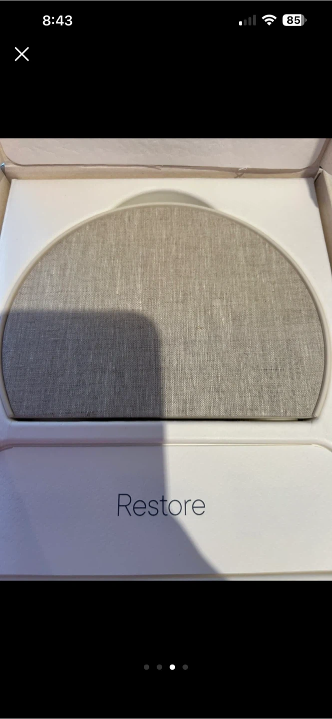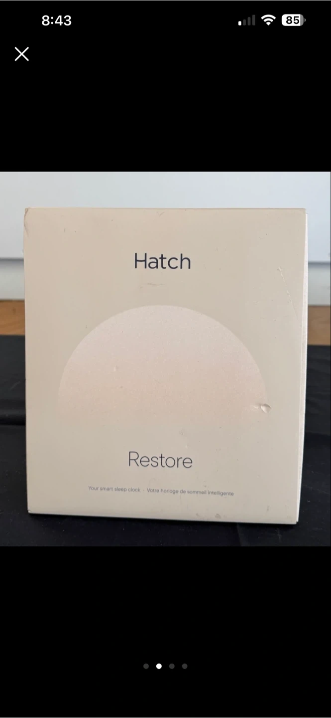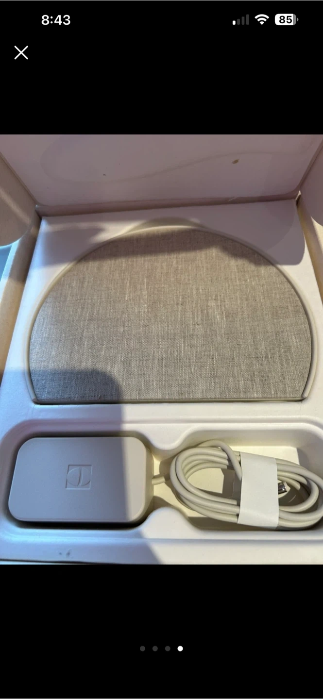 This is a -new opened box Hatch Restore3 sound machine, sunrise alarm and white noise machine. This device is designed to improve sleep quality and create a relaxing bedtime routine. It includes a variety of sound options and customizable light settings to help you fall asleep and wake up naturally.