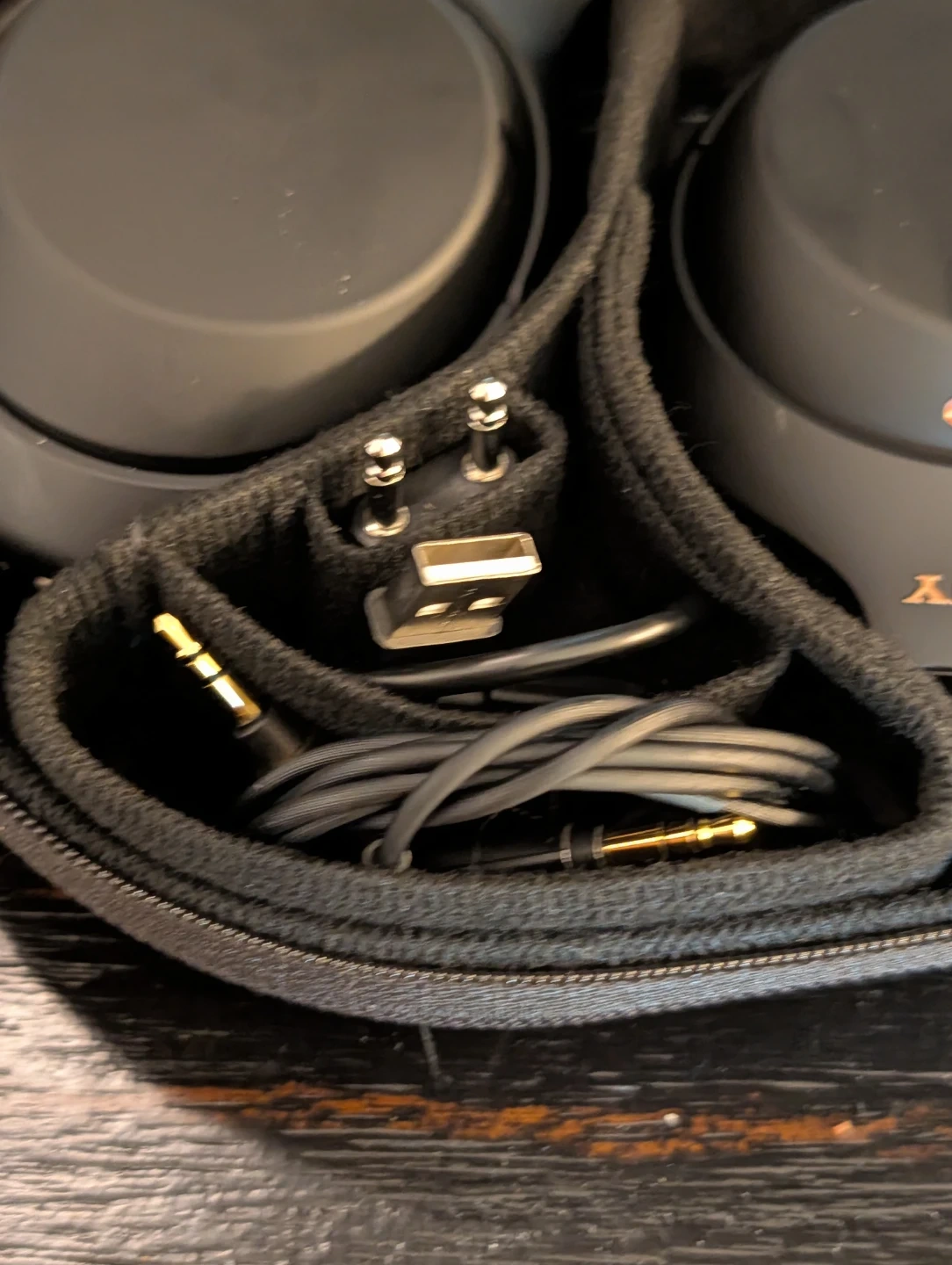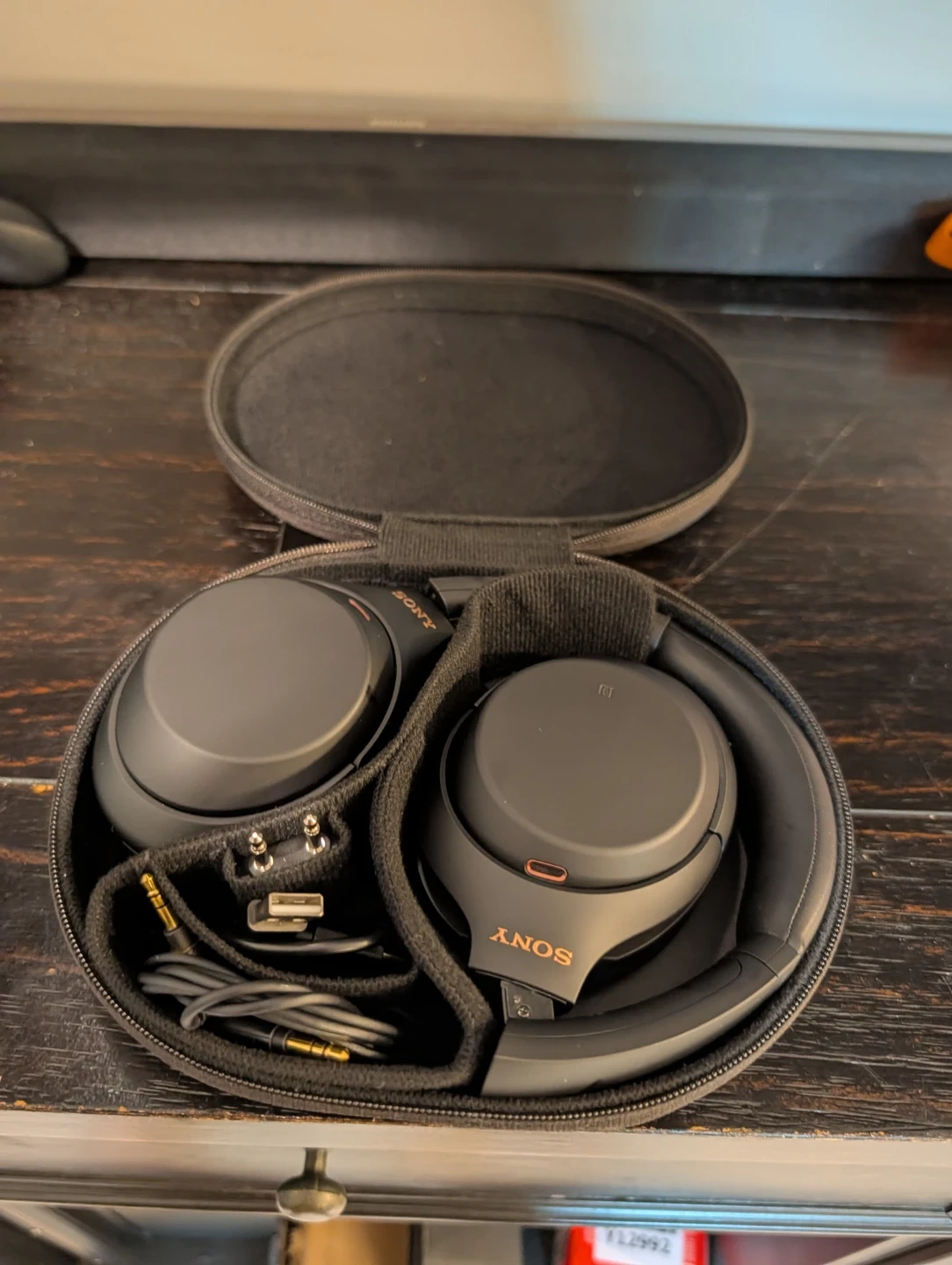 Sony WH-1000XM3 over-ear noise cancelling headphones in black. Includes carrying case, USB charging cable, audio cable, and airplane adapter. These are wireless Bluetooth headphones.