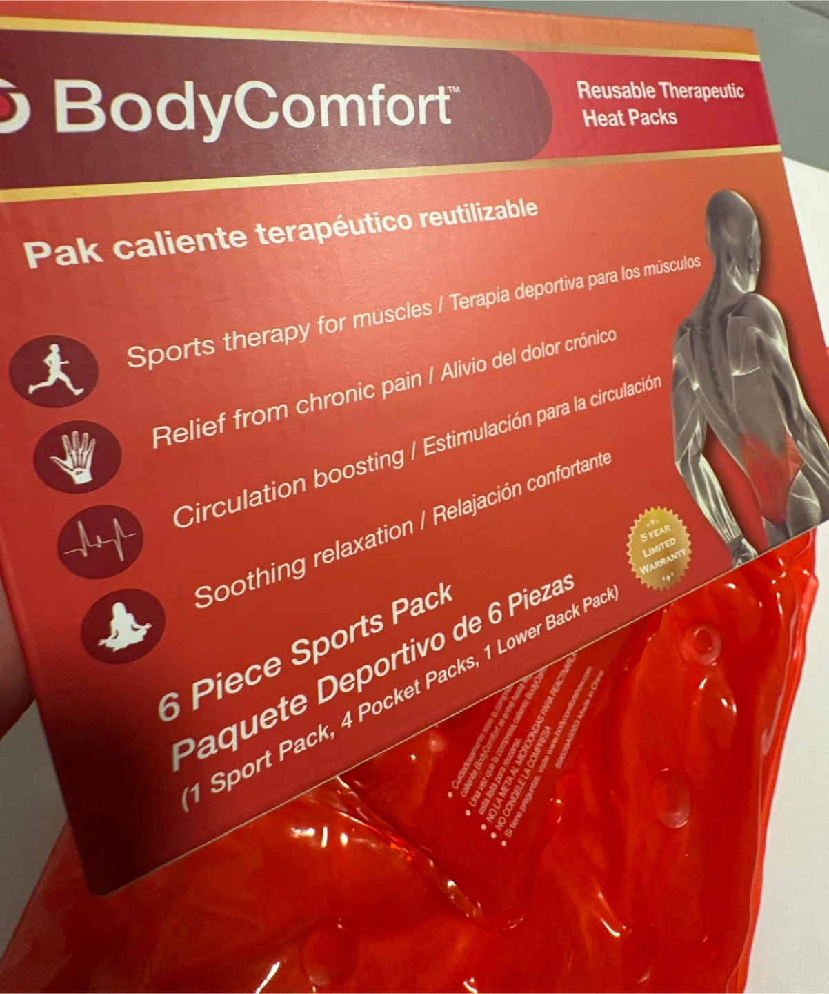 *This is a 6-piece sports pack of reusable therapeutic heat packs from BodyComfort. It's designed for sports therapy, relief from chronic pain, circulation boosting, and soothing relaxation. The pack includes 1 sport pack, 4 pocket packs, and 1 lower back pack. => this box is new, unopened.
