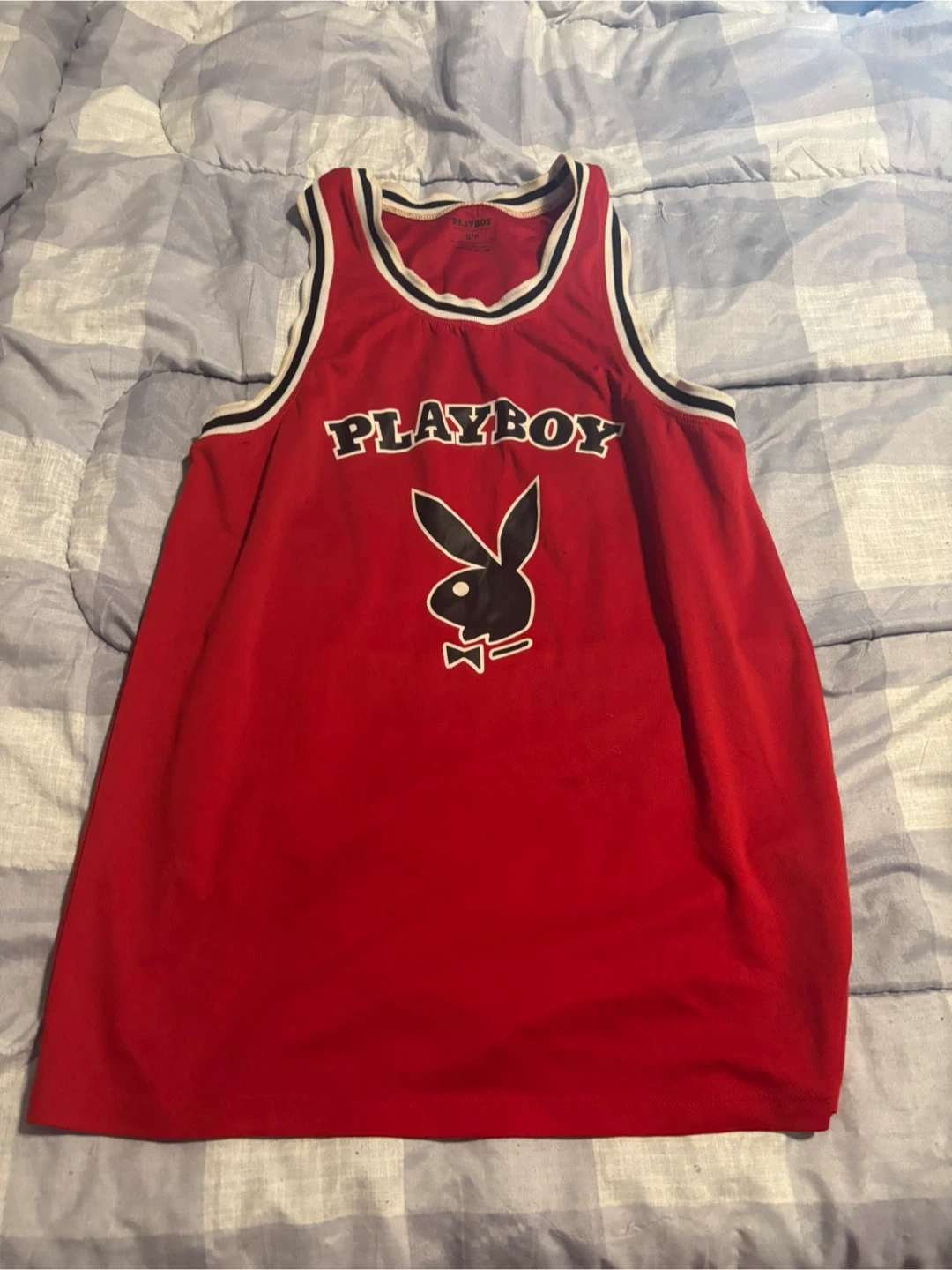 This is a red Playboy basketball jersey featuring the iconic Playboy bunny logo. It's a size S/G. It has white and black trim around the neckline and armholes.