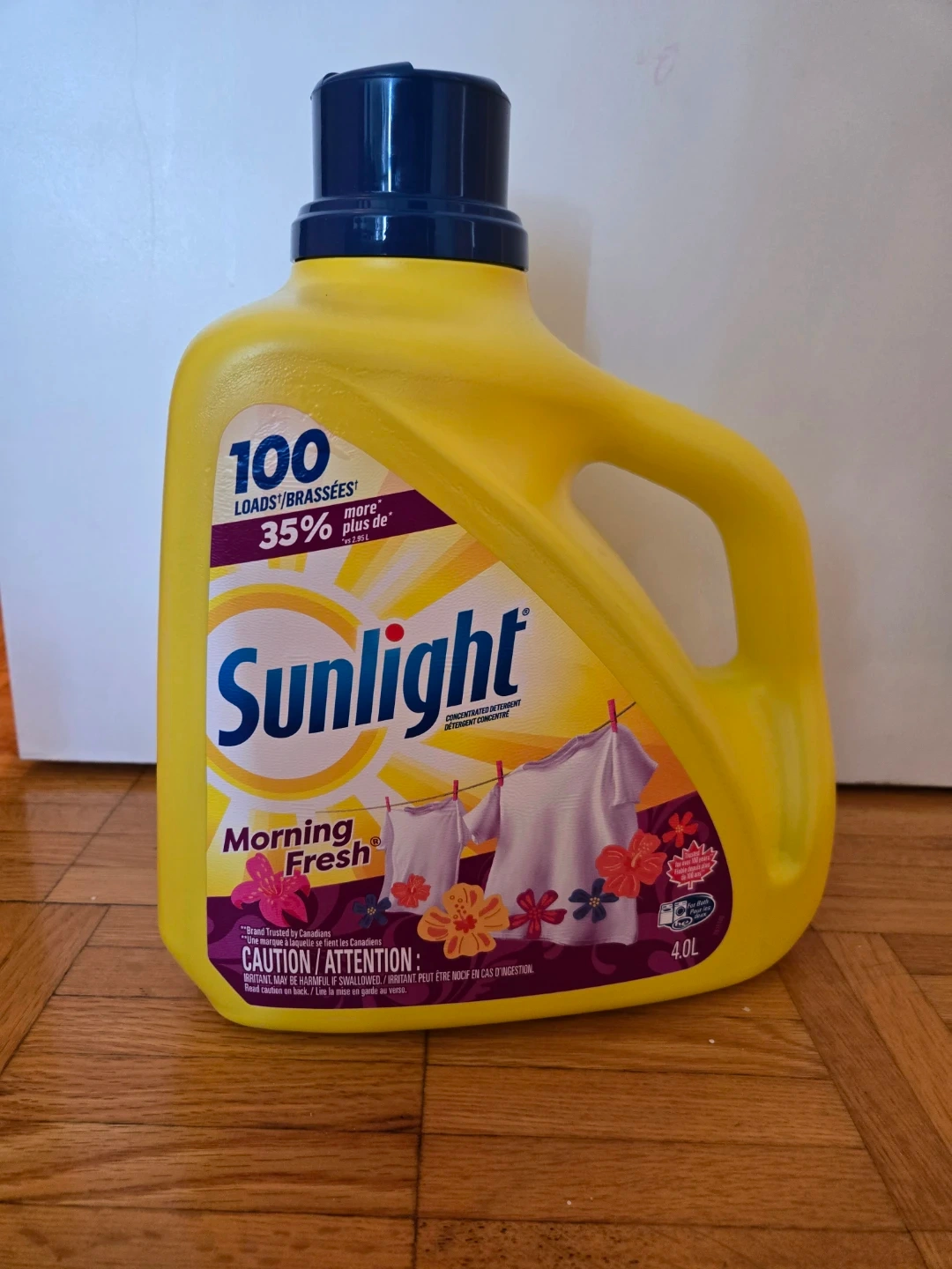 Sunlight Morning Fresh concentrated liquid laundry detergent comes in a 4.0L bottle. It's designed for 100 loads