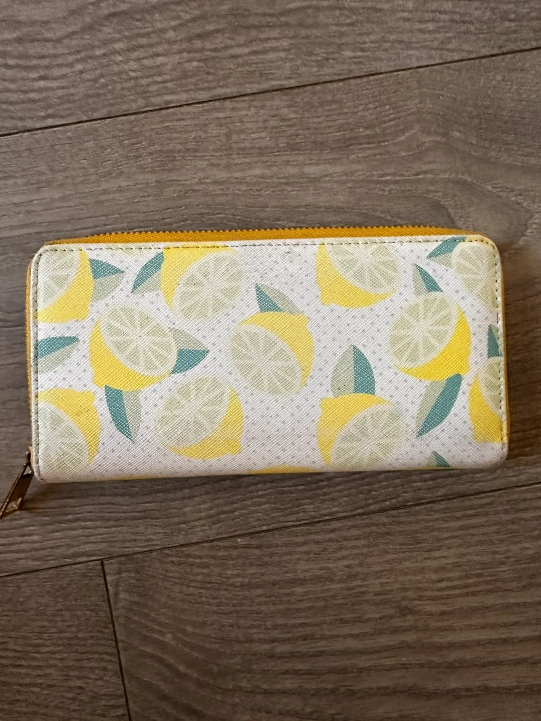 This zip-around wallet features a fun yellow lemon print. It has multiple card slots and a zippered coin pocket inside. The exterior is a bright yellow with a white panel showcasing the lemon pattern.