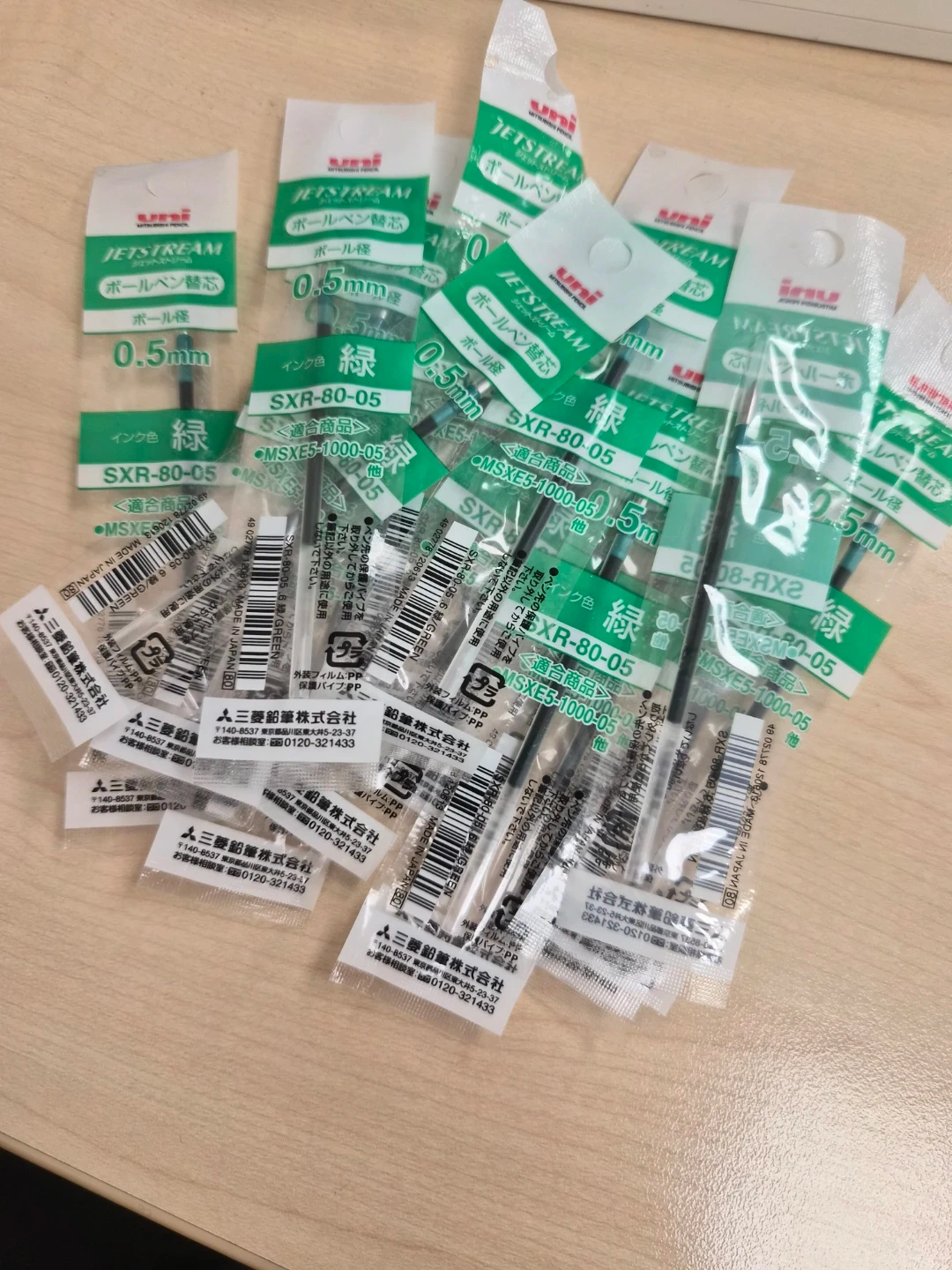 This is a lot of Uni-ball Jetstream ballpoint pen refills. They're the SXR-80-05 model, featuring a 0.5mm tip size and green ink. These refills are compatible with various Uni-ball Jetstream pens, including the MSXE5-1000-05. You'll have plenty of refills to keep your favourite pen going!