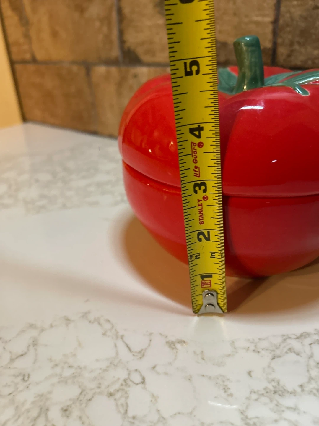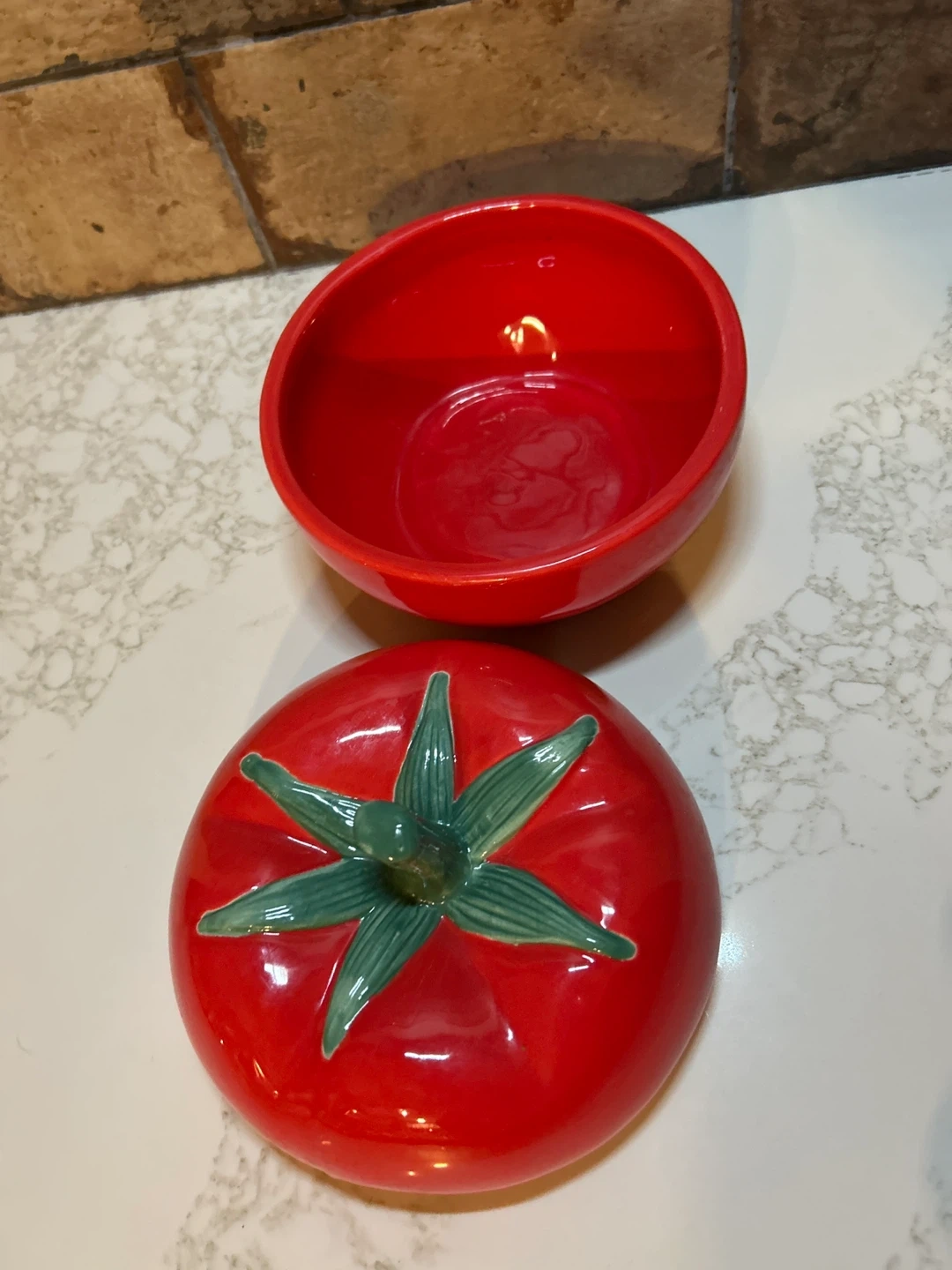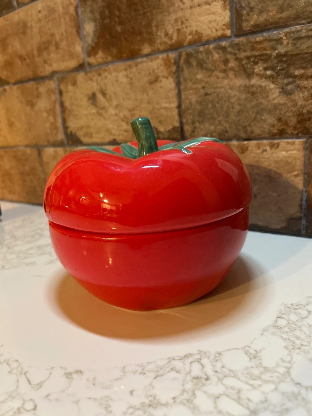 This fun ceramic dish is shaped like a bright red tomato! It's perfect for holding candy, trinkets, or small snacks. It stands about 5 inches tall. Great for your kitchen counter or as a quirky decor piece!