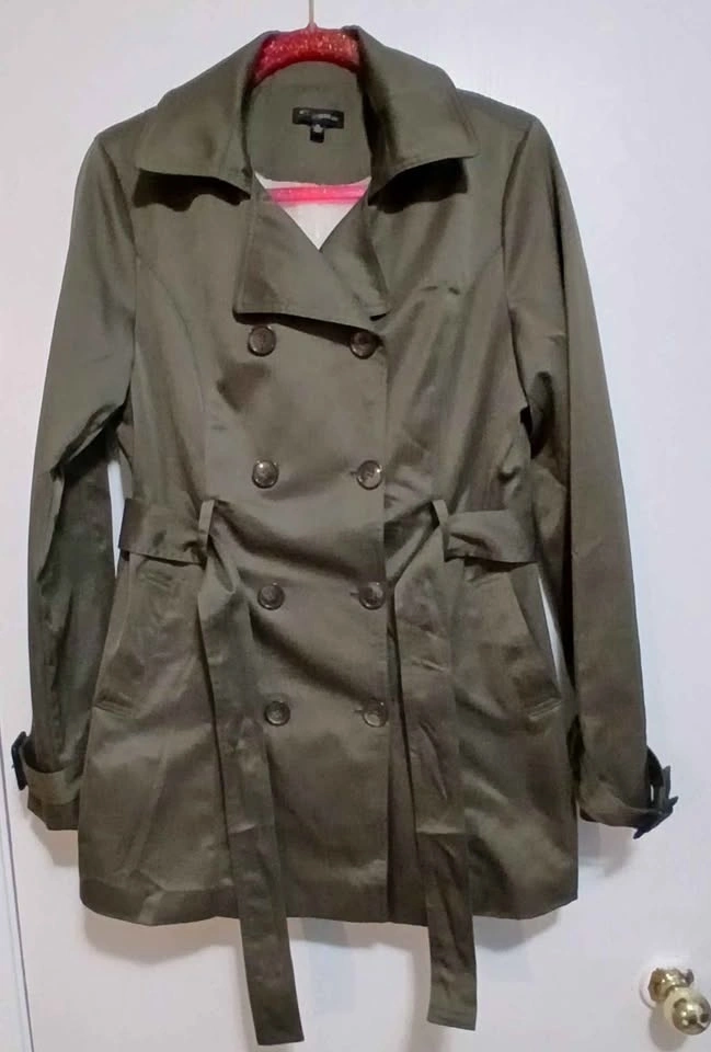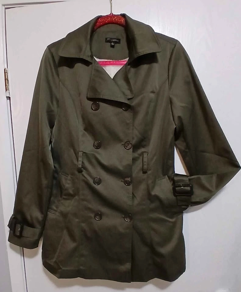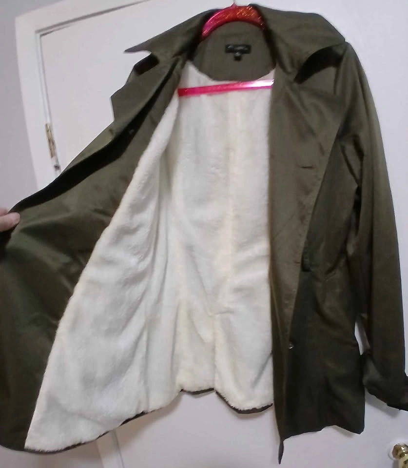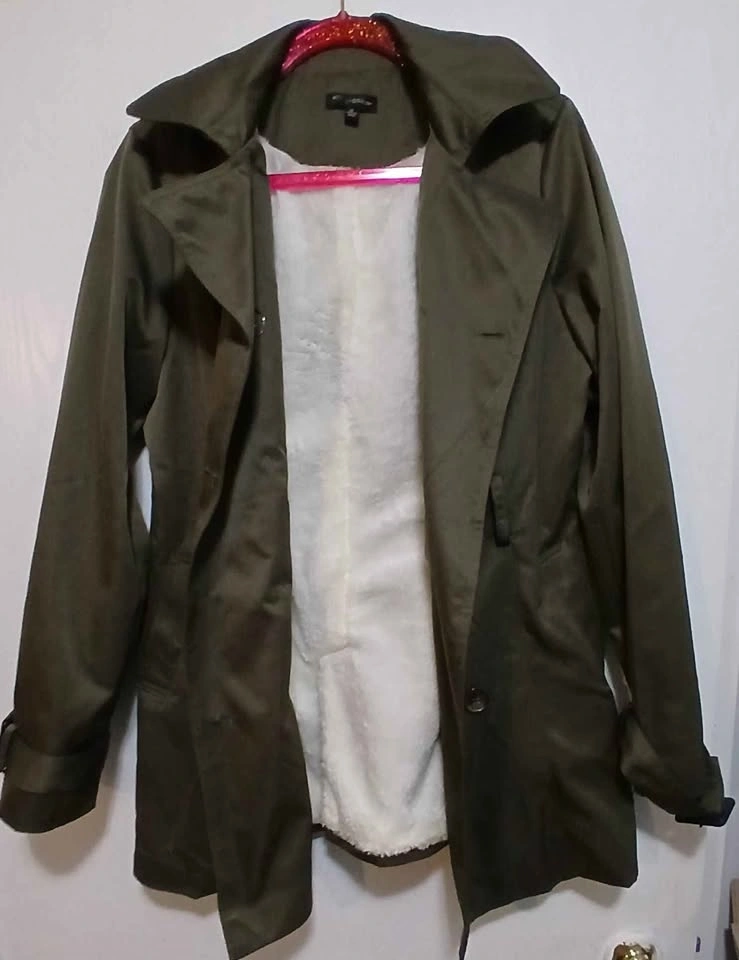 π₯π₯π₯A double-breasted, olive green, with Sherpa lining. The outside of the coat has a satin Lake scene to it, making it perfect for anything from casual to more formal wear.
