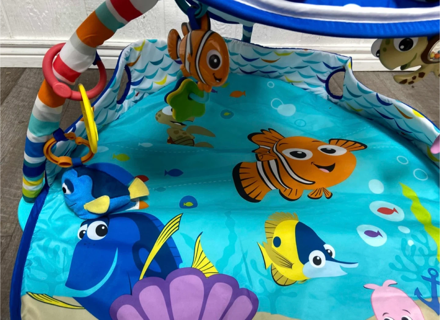 This play mat features characters from Disney's Finding Nemo, including Dory and Nemo. It's designed for tummy time and play. Includes several colourful hanging toys.