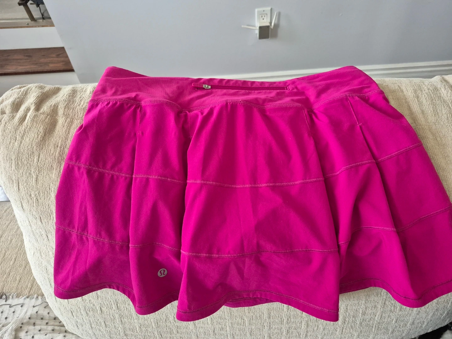 This Lululemon skirt is perfect for tennis or running. It's made of stretchy material for comfort and has a zippered pocket at the back. The hot pink colour is vibrant and fun! It features a pleated design for a classic look.