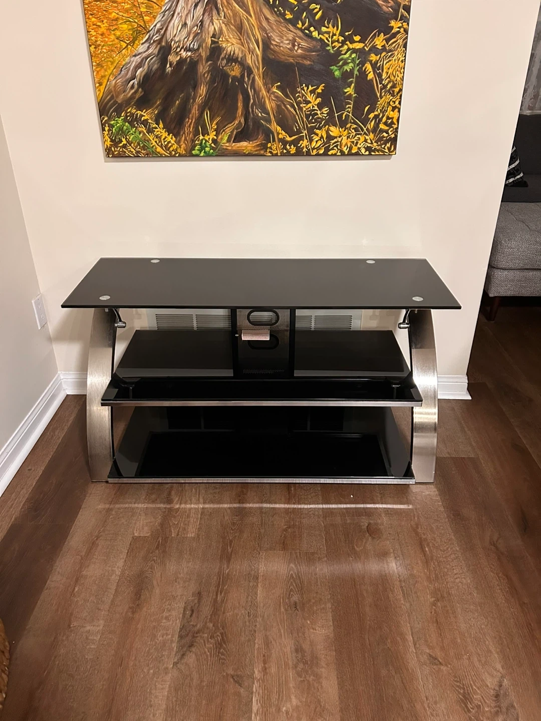 Selling a black glass TV stand in great condition! It has multiple shelves for media components or decor. The stand features a sleek design with silver accents. Perfect for any living room setup!
