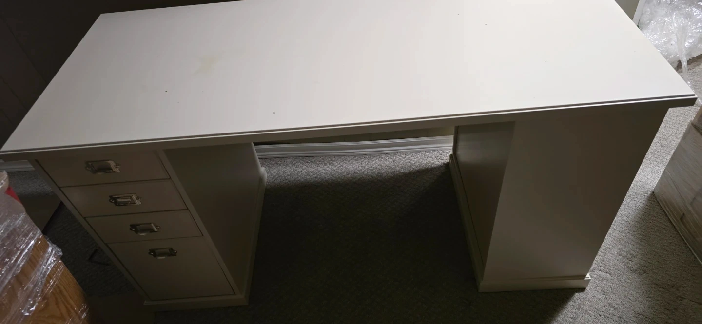 This white executive desk offers ample workspace and storage. It features a set of four drawers on one side and open shelving on the other. The neutral colour makes it versatile for any office or home setup. Perfect for organizing your work essentials and keeping your space tidy!