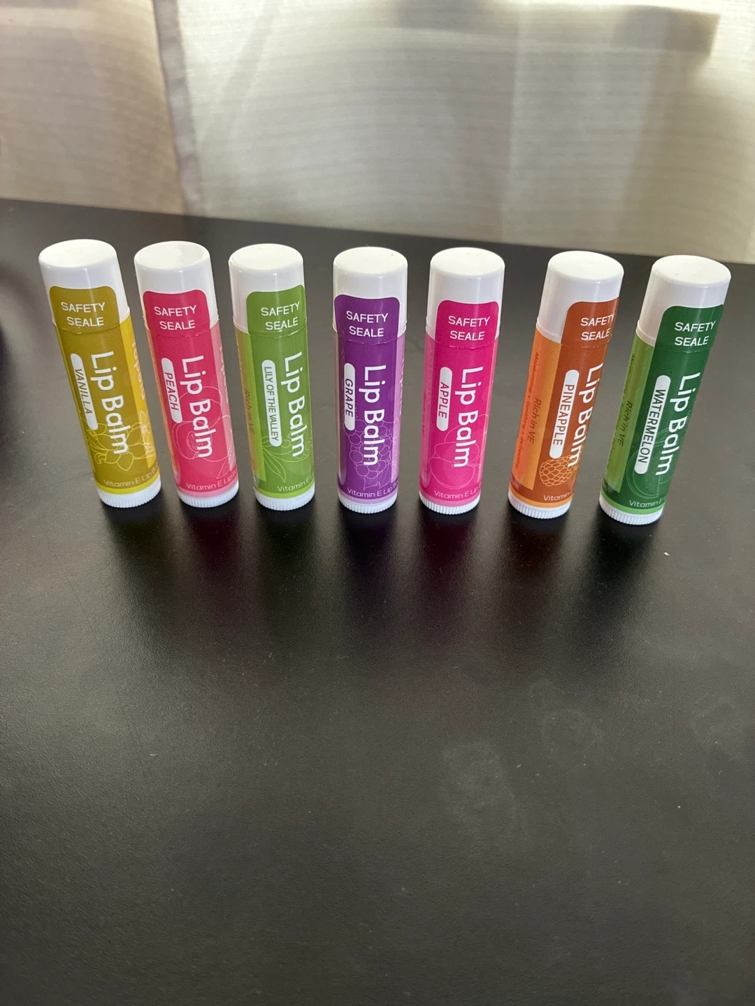 This set includes seven lip balms in various flavours: Vanilla, Peach, Lily of the Valley, Grape, Apple, Pineapple, and Watermelon. They're all enriched with Vitamin E. Each one has a safety seal intact.