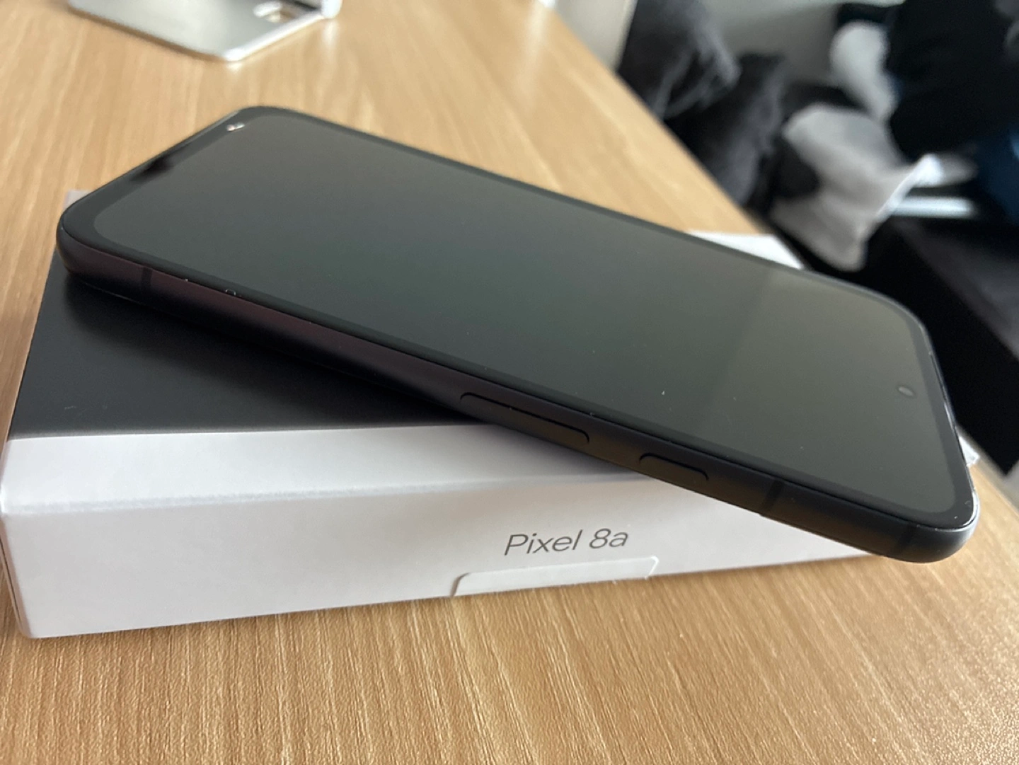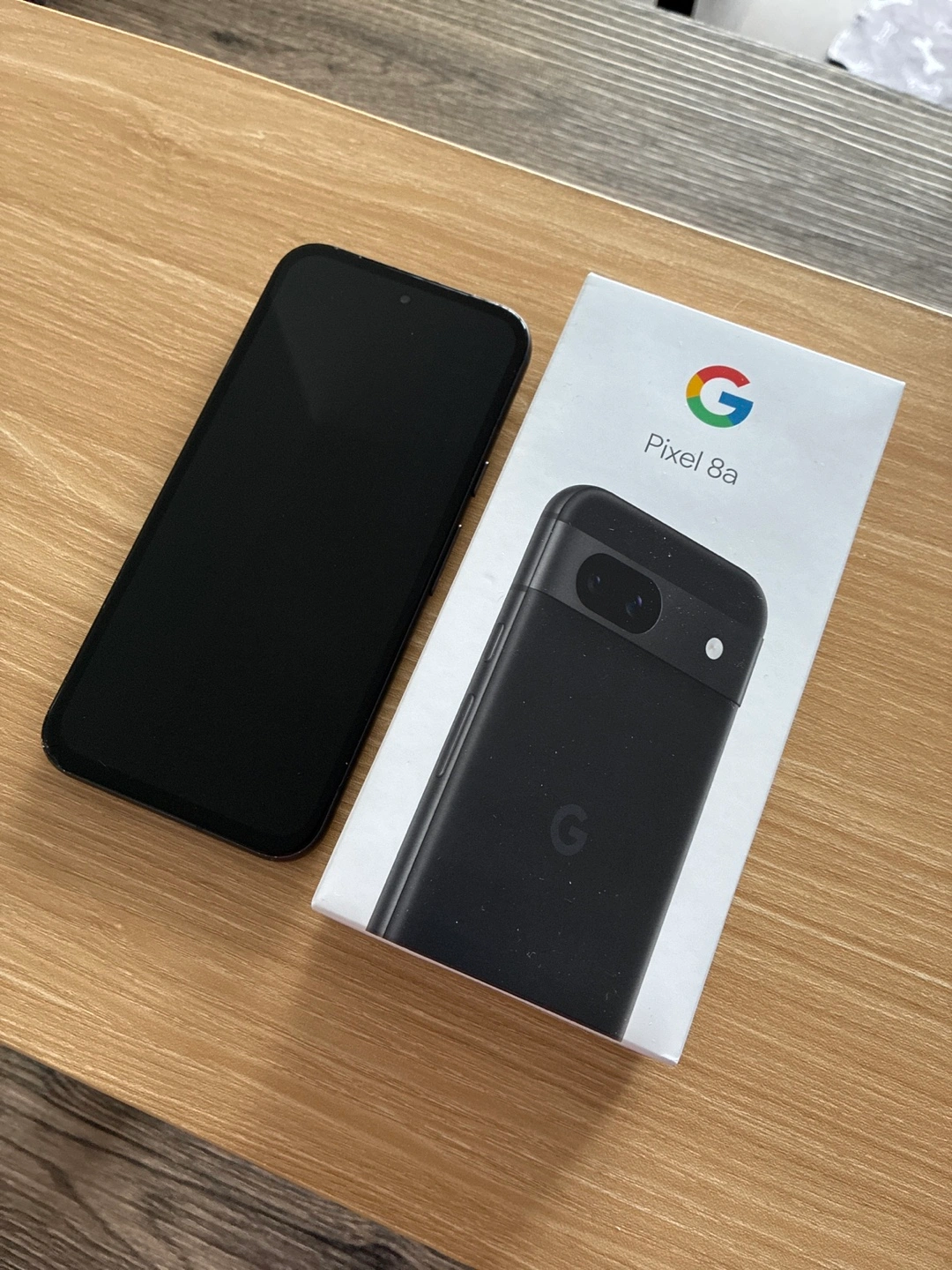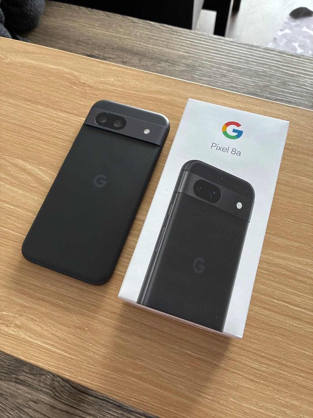 Google Pixel 8a in Obsidian, 128gb. Includes original box and unused charging cable and port adapter (brand new). Minor cosmetic damage visible on the bottom-left edge, but no color/ink distortions and no touch calibration issues at all. Works great.
