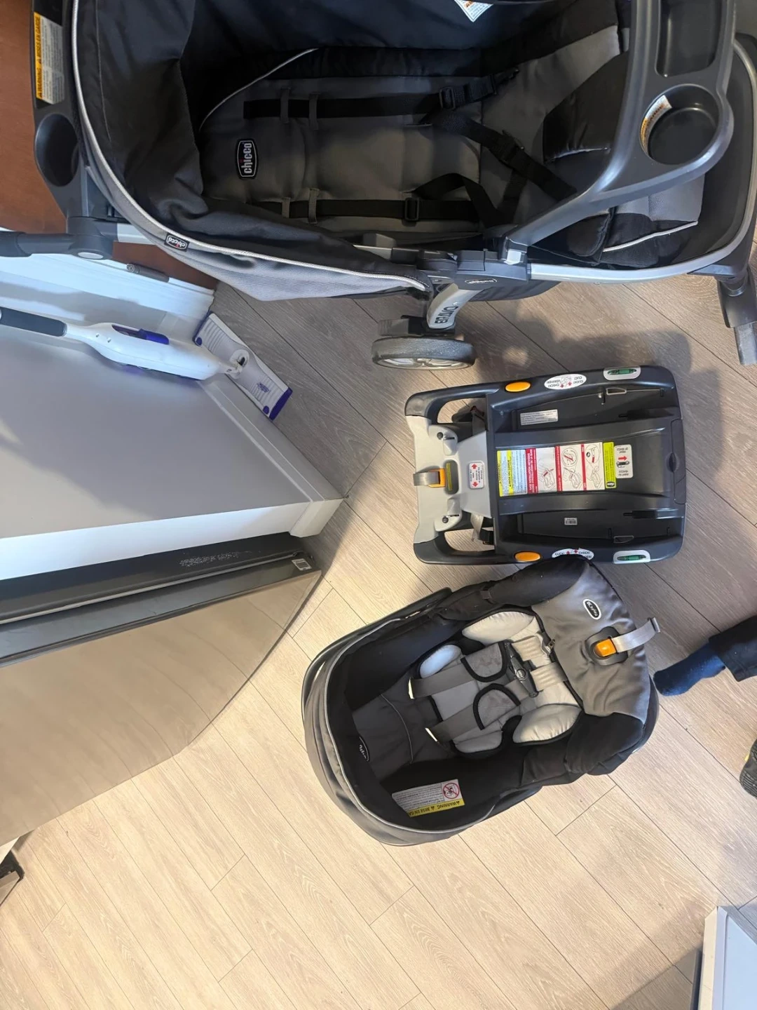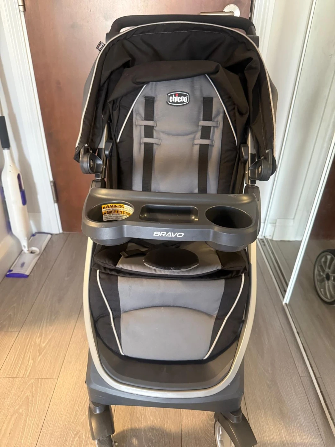 This Chicco Bravo travel system includes a stroller and a compatible car seat. It features a convenient one-hand fold for easy storage and transport. The stroller has multiple recline positions and a large canopy for sun protection. It's been used only for couple months.