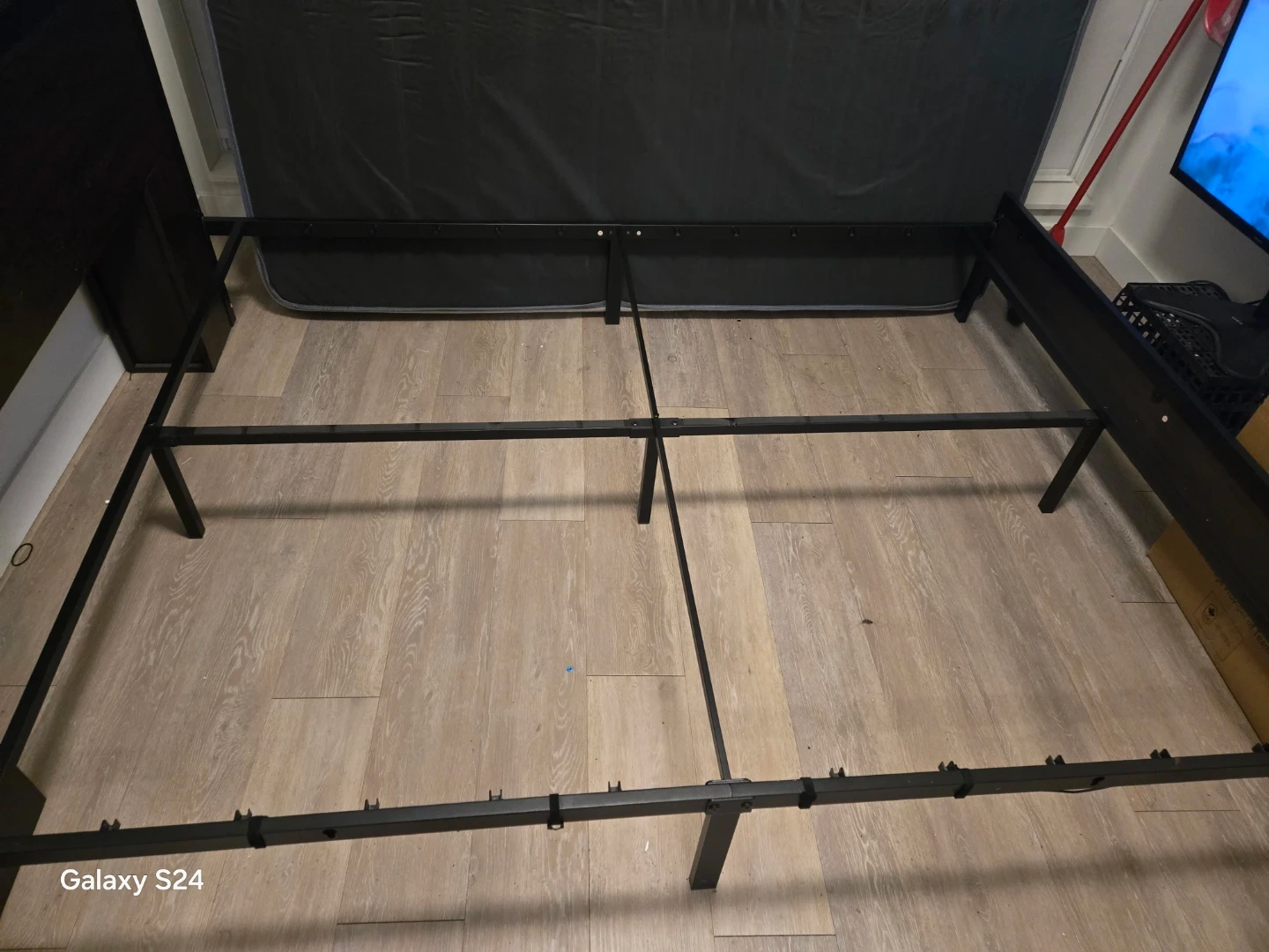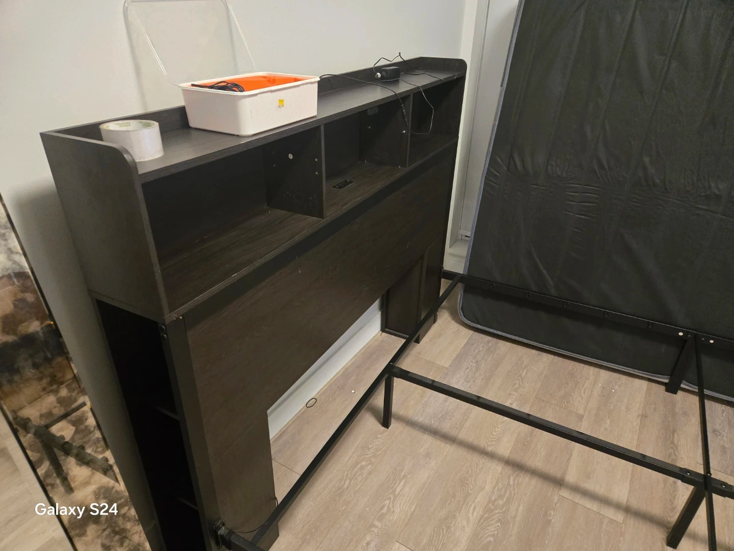 Selling a queen size bed frame. It features a headboard with built-in shelving and LED lights underneath the bed frame. It’s in great condition and would be a nice addition to any bedroom!