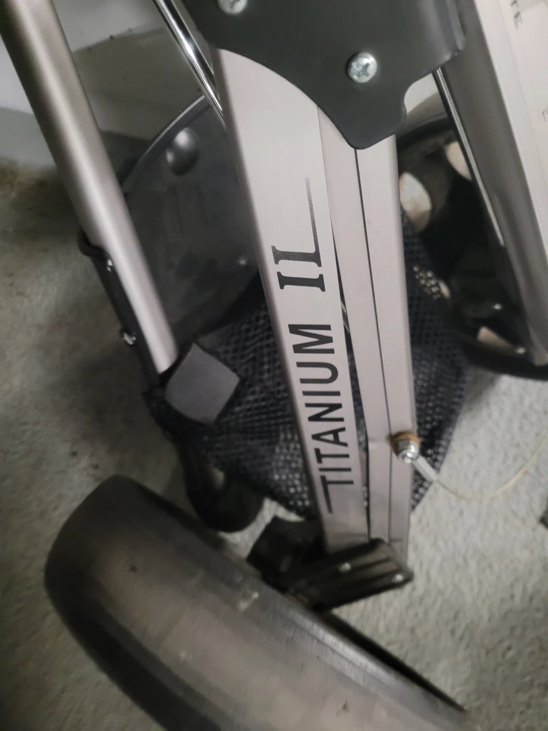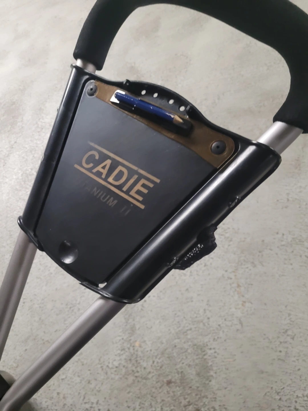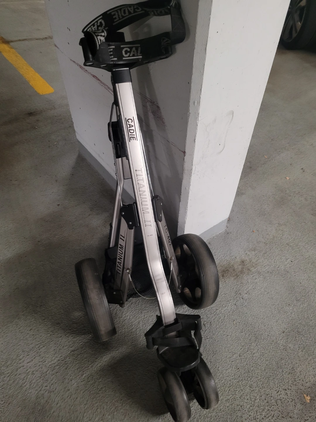 This CADIE Titanium II golf push cart is super lightweight and made from titanium composite. It features a mesh storage basket and a comfortable handle. Great for carrying your golf bag around the course!Has four wheels