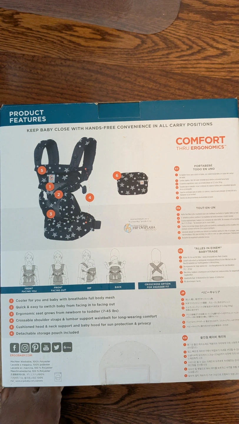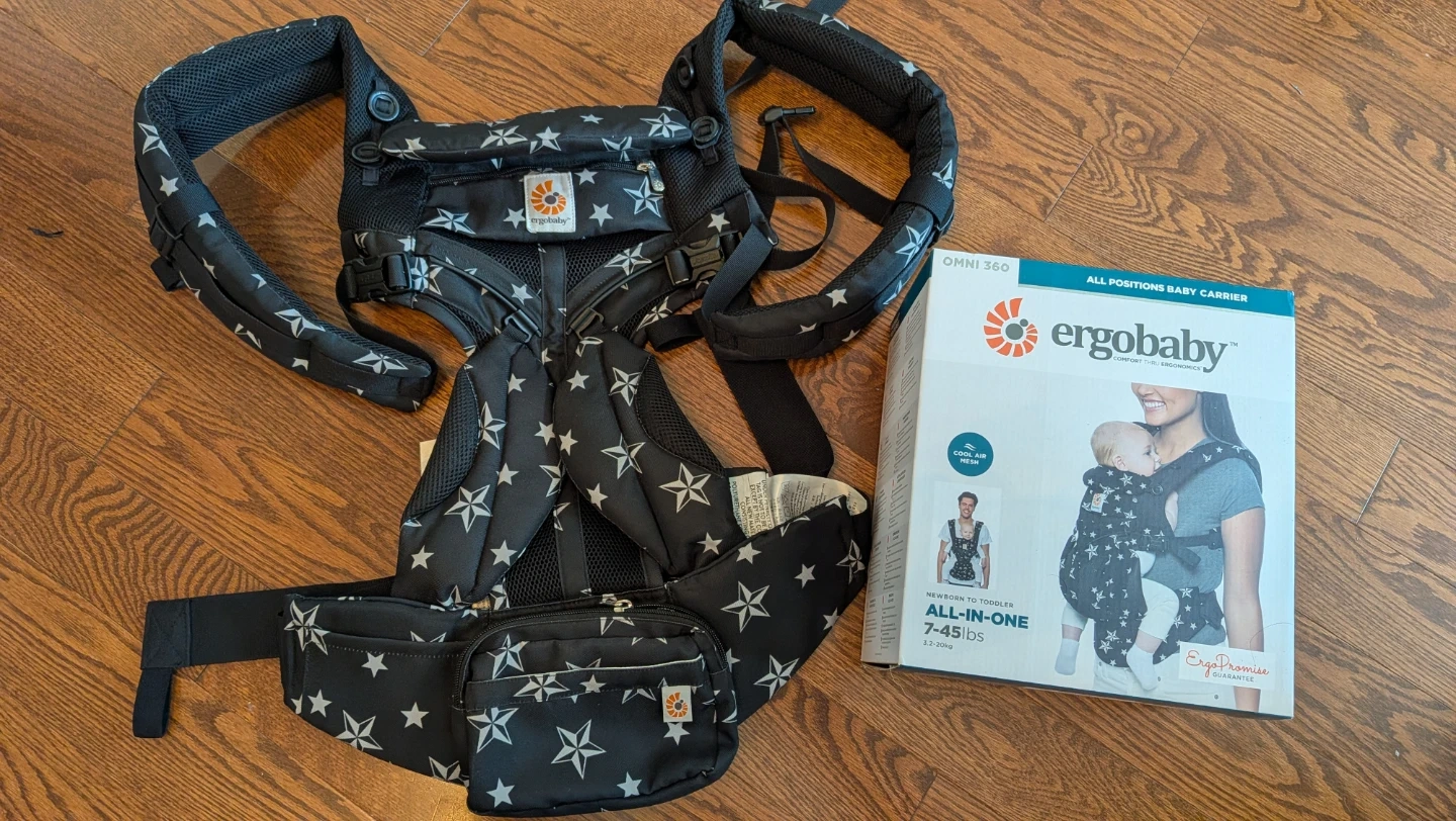 Ergobaby Omni 360 baby carrier in black with white stars. It's an all-in-one carrier with multiple carrying positions. Made from 100% polyester. Includes a detachable storage pouch.