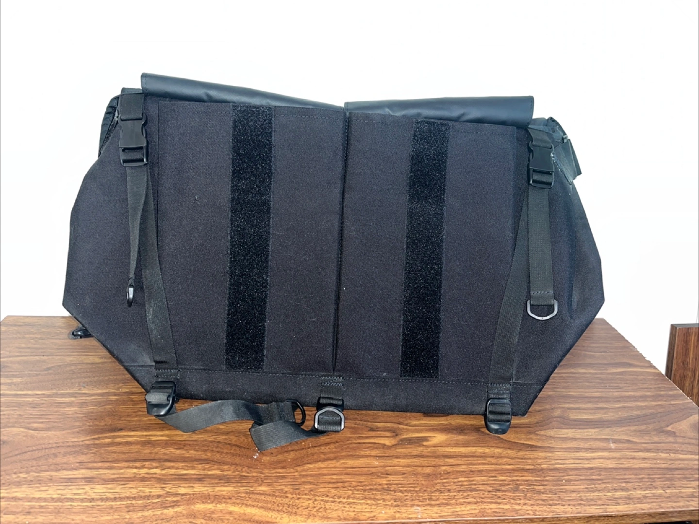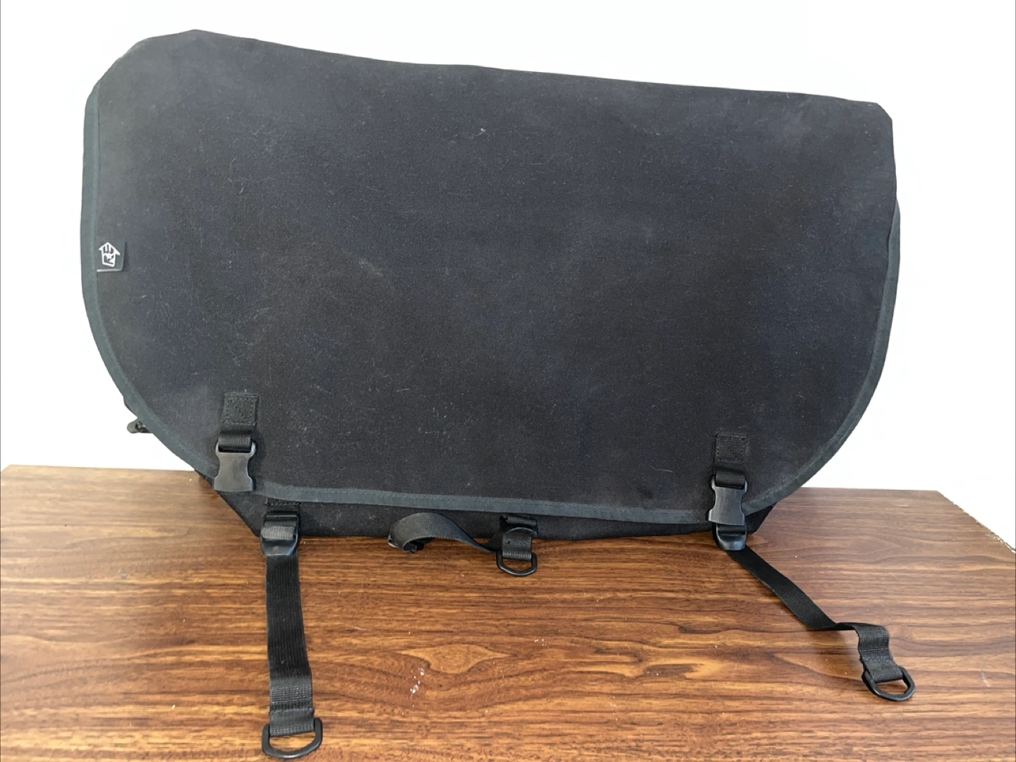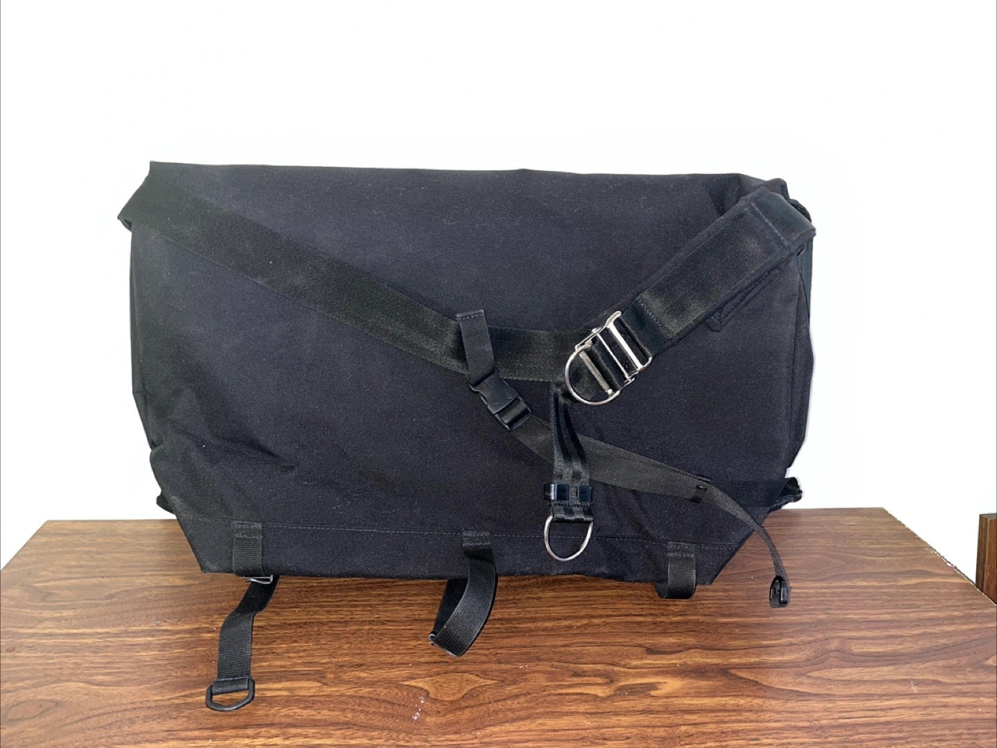 This black messenger bag features a waterproof interior lining. It has multiple buckles for closure and adjustable straps. Rarely used.