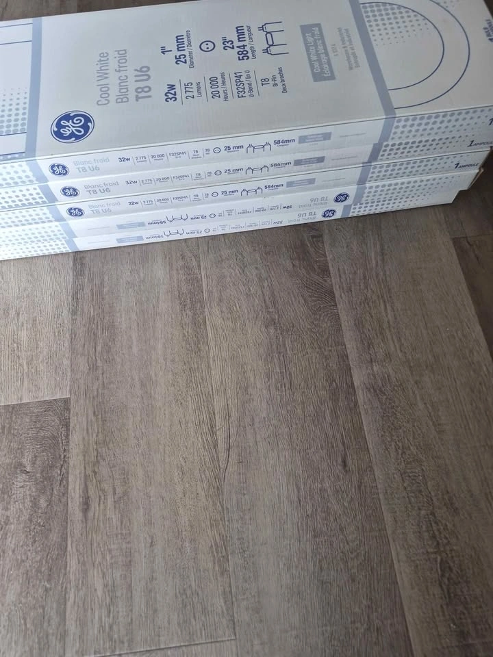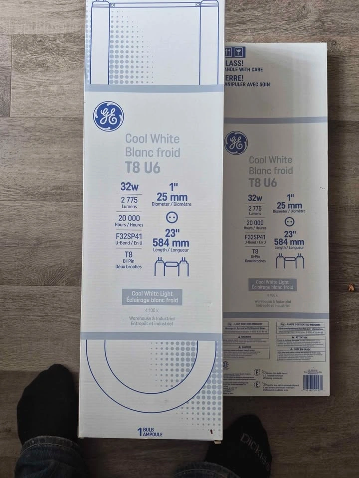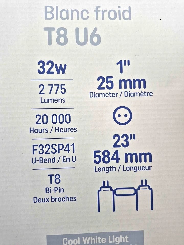 I have 6 new GE T8 U-Bend fluorescent light bulbs. These are 32W with 2775 lumens and a 20,000 hour lifespan. They are F32SP41, 23 inches (584 mm) long, and have a 1 inch (25 mm) diameter. Cool white light at 4100K, good for warehouse or industrial spaces. Bi-pin base. Got a few of these if you need more than one. $16 a piece or $13 a piece if you take all 6.