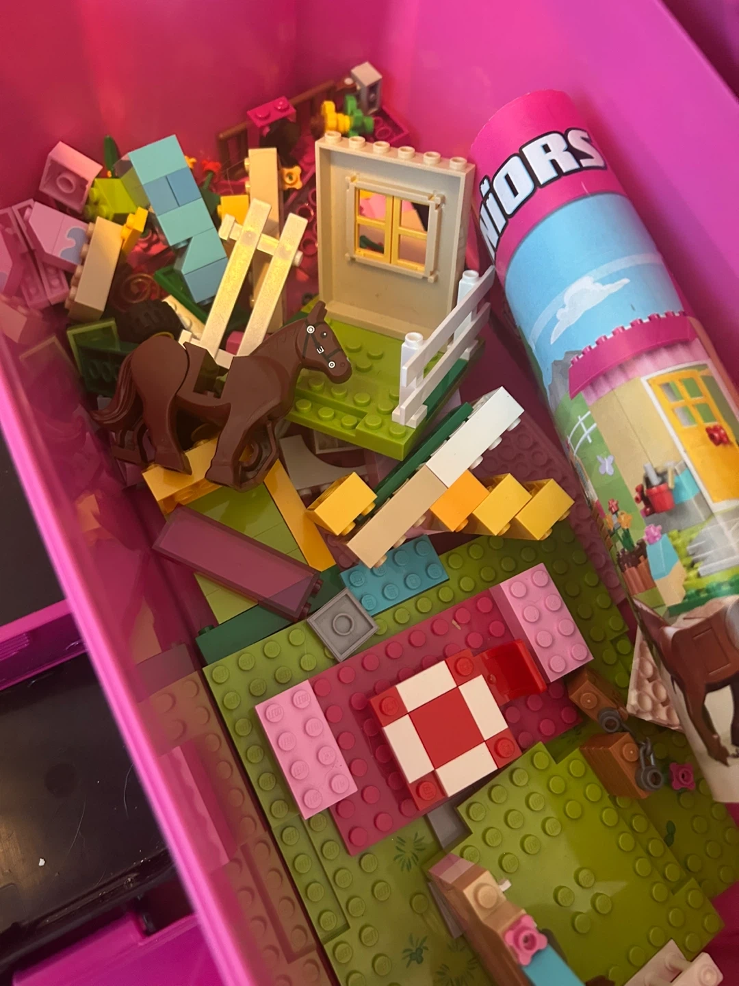 LEGO Storage Bin, divider case, and LEGO friends ranch set