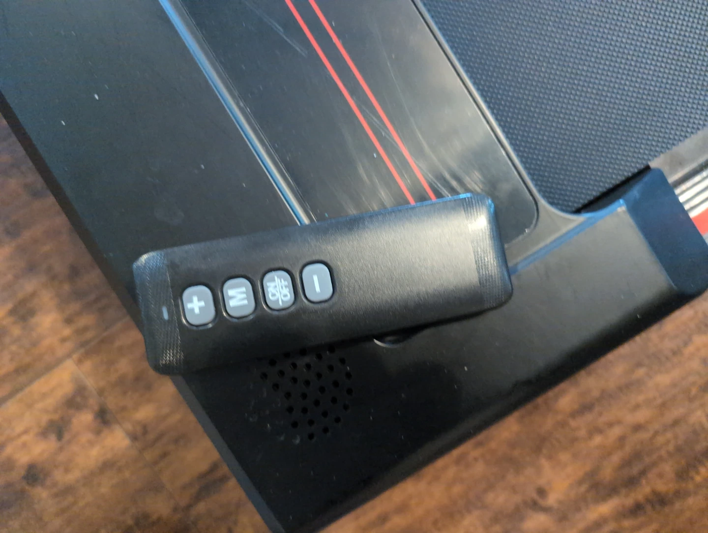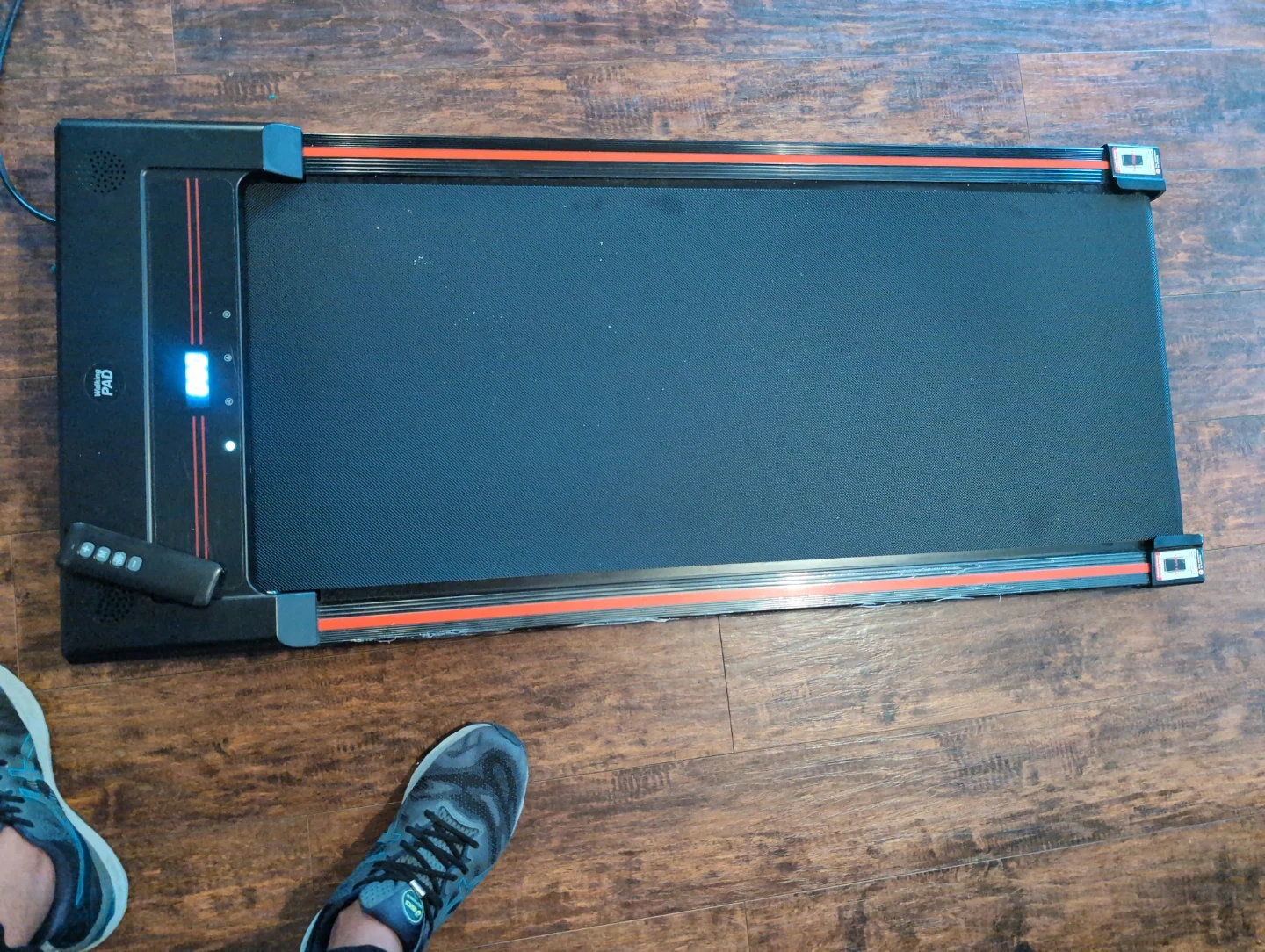 This is a portable walking pad treadmill. It comes with a remote for speed control.