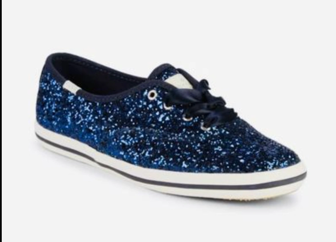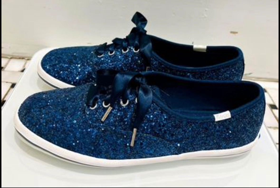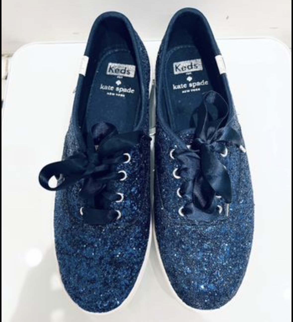 15New, size 7 Women’s Kate Spade x Keds sneakers Navy Blue Glitter dipped canvas with rubber heel. 0.8” heel, satin laces, rounded closed toe.