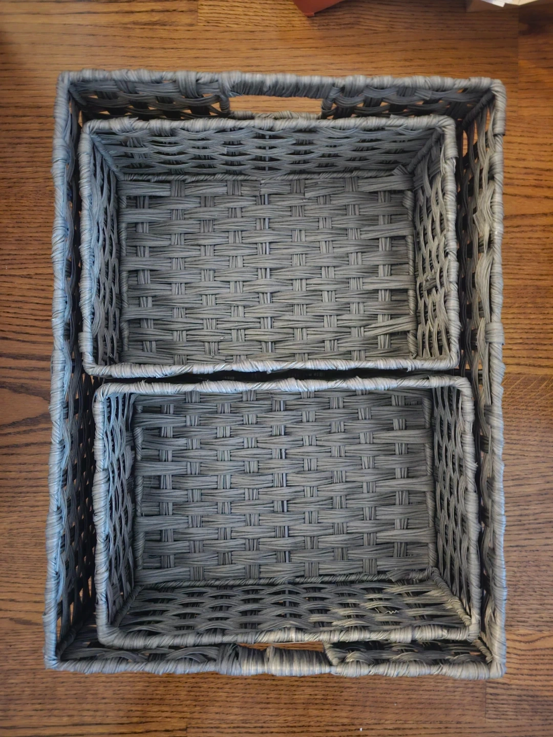 Two grey woven storage baskets with integrated handles. Perfect for organizing shelves or keeping items tidy. The material is a durable woven plastic. Pickup at 763 Bay St