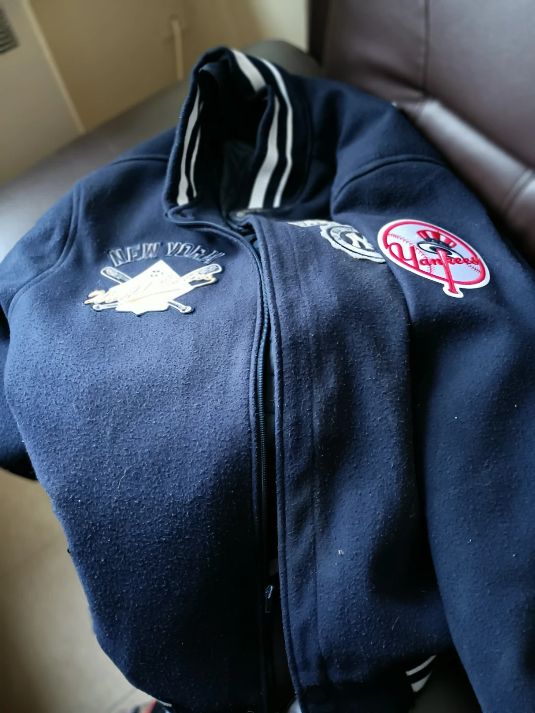 This is a navy blue varsity jacket with "New York" written across the back. It features New York Yankees patches on the front and has a striped collar and cuffs. A great jacket for any fan!