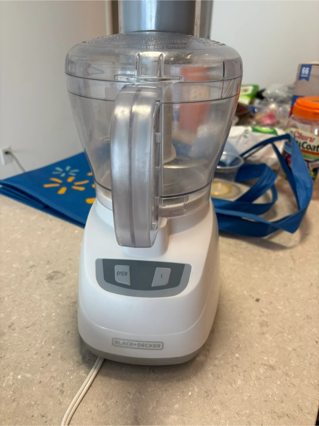 This is a compact BLACK+DECKER food processor. It has two speed settings and a pulse function. It's perfect for small chopping and mixing tasks in the kitchen.
