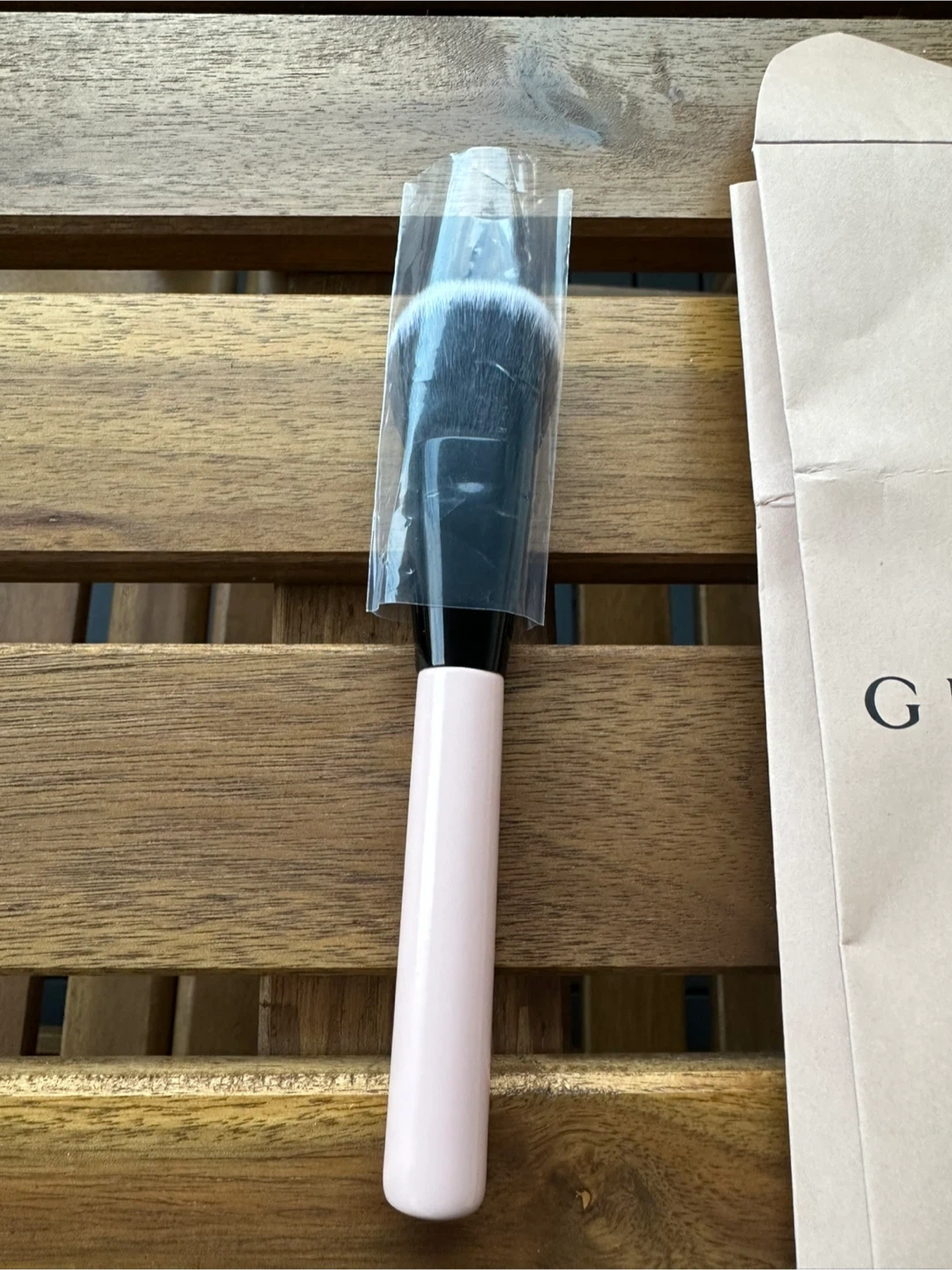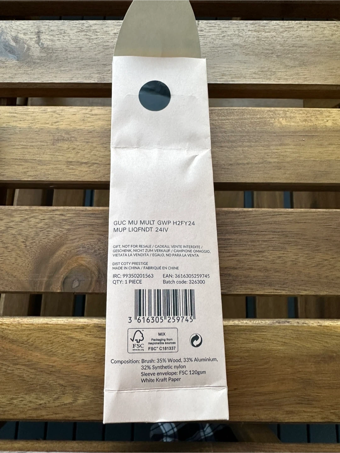 This is a Gucci Beauty makeup brush. It's made with 33% aluminium, 33% synthetic nylon, and 33% wood. The sleeve is made from FSC 120gsm white kraft paper. This brush is great for applying makeup!