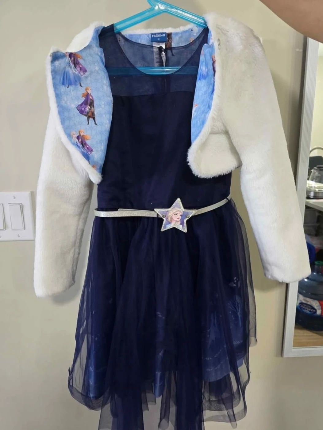 This lovely navy blue dress features a beautiful tulle overlay with a Frozen II theme. It comes with a white faux fur bolero jacket and a sparkly belt with an Elsa design. Size 10.