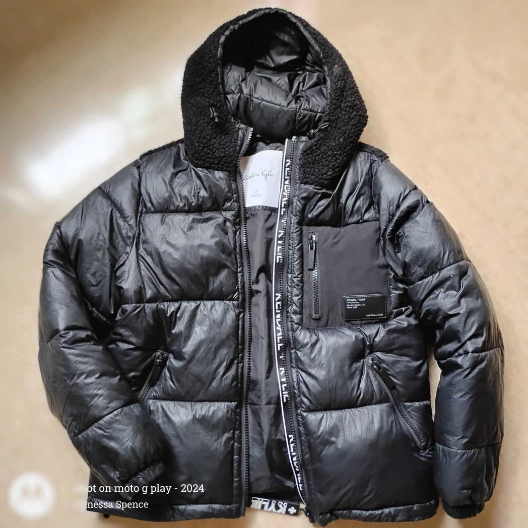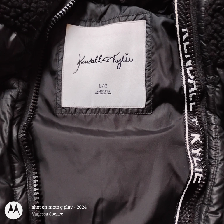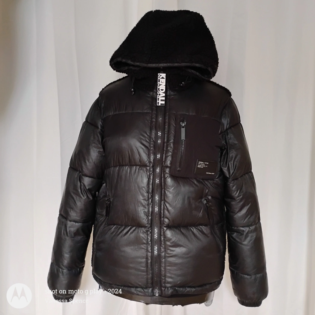 Selling a Kendall + Kylie black puffer jacket in size L/G. It has a sherpa-lined hood and some stylish details. There's a small imperfection on the arm, as shown in the photos, but otherwise it's in good condition! Open to offers!