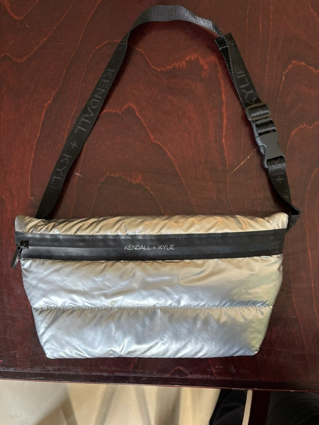 10Selling a cute Kendall + Kylie crossbody bag! It's a stylish silver colour and perfect for carrying your essentials. The strap has the Kendall + Kylie logo on it