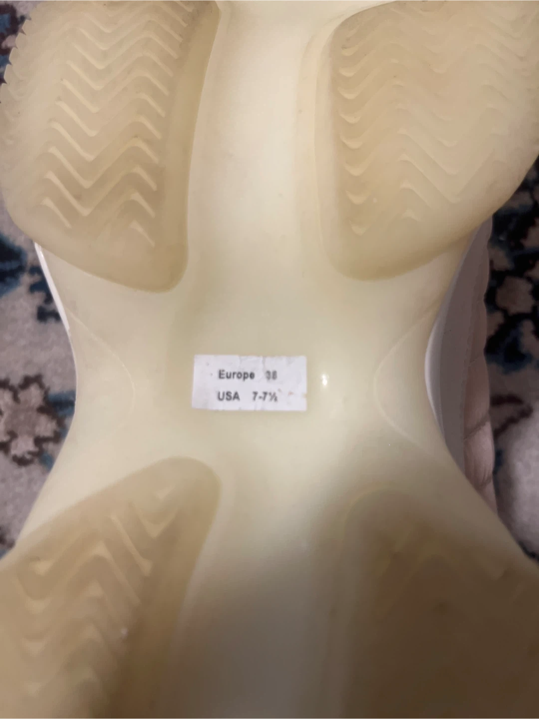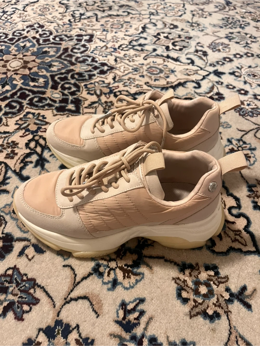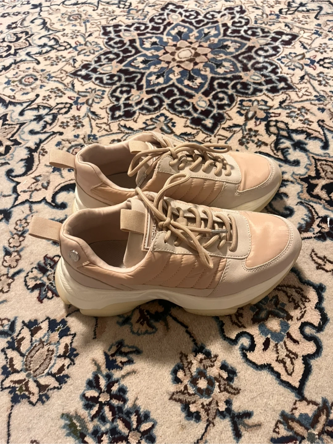 87These are a pair of Kendall + Kylie women's sneakers in a light beige colour. They have a unique design with a puffy, quilted texture on the sides and a thick, white sole. They look comfy and stylish! Size in USA: 7-7 1/2. Europe 38. Used only a couple of times.