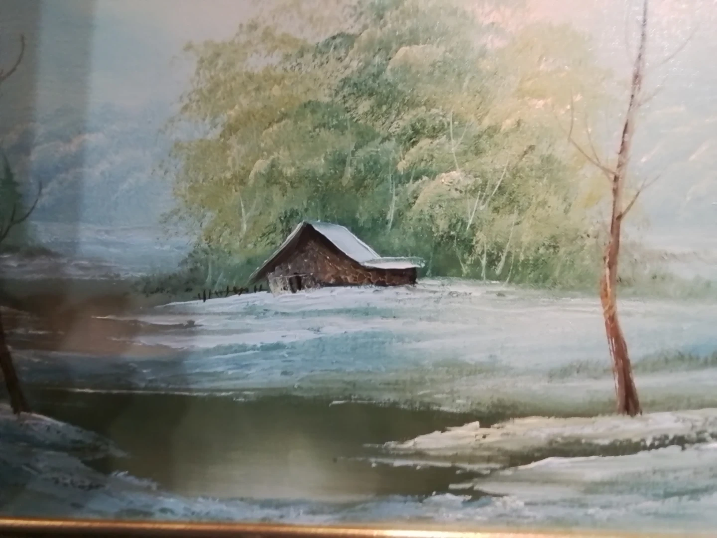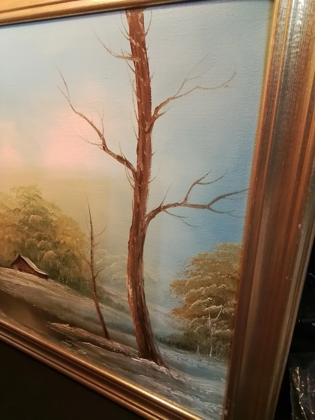 I'm offering an original winter landscape painting, signed by the artist. This serene piece captures a tranquil winter scene with a cabin near a frozen pond. The painting is oil on canvas (OOC) and measures 23.25 inches by 19.5 inches. The use of colours brings a peaceful, cold feeling to the piece, suitable for any room needing a touch of calm.