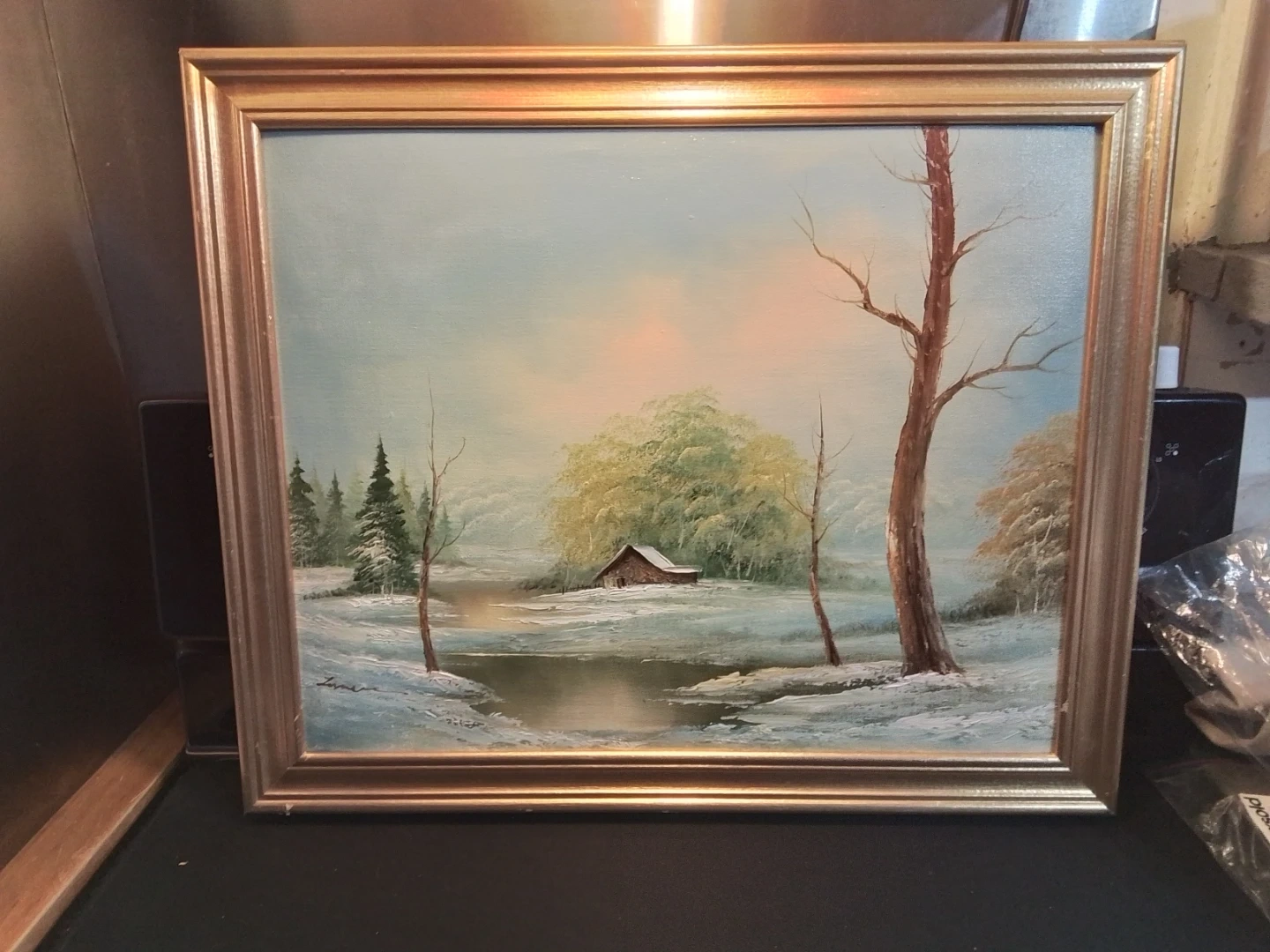 Oil on canvas painting of a winter cabin scene. Features a snow-covered landscape with trees and a rustic cabin near a frozen body of water. It's signed by the artist, 'Lenue'. Ready to hang with a gold-toned frame.