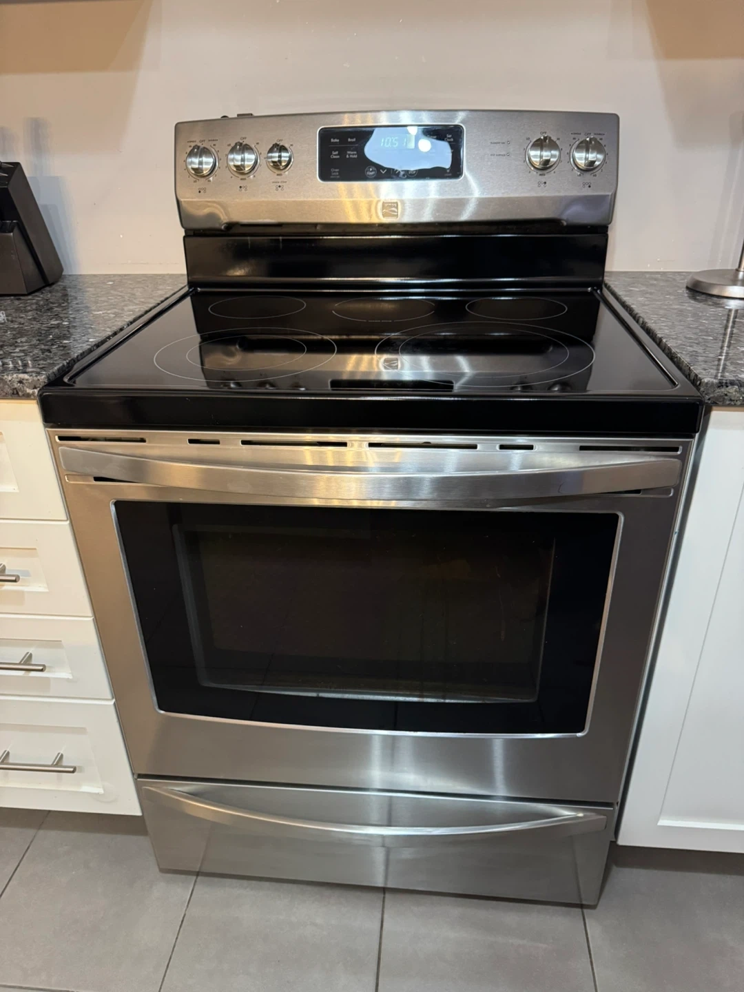 Kenmore Electric range stove and Hood in good working condition. It has a smooth top and standard oven features. Ready for a new home!