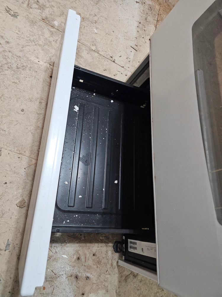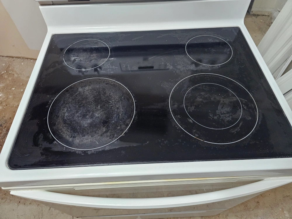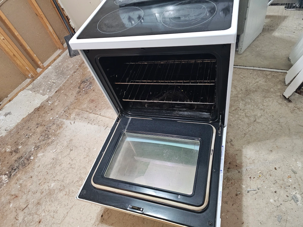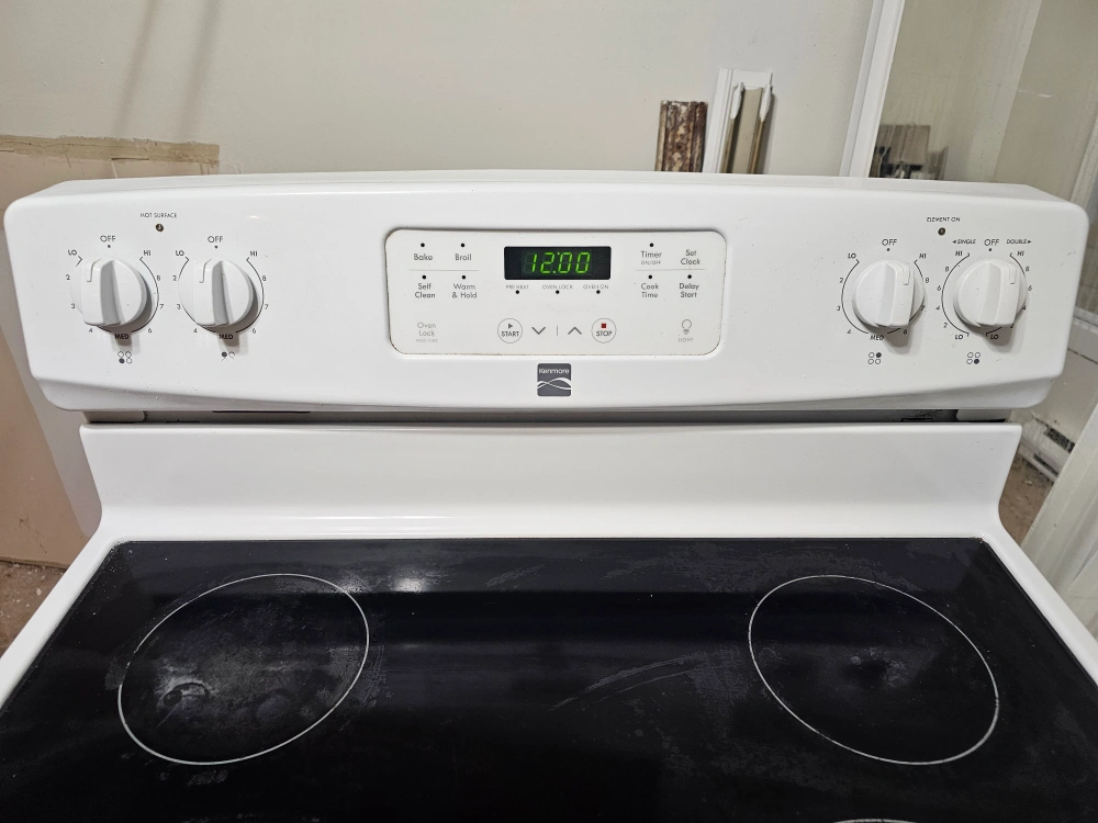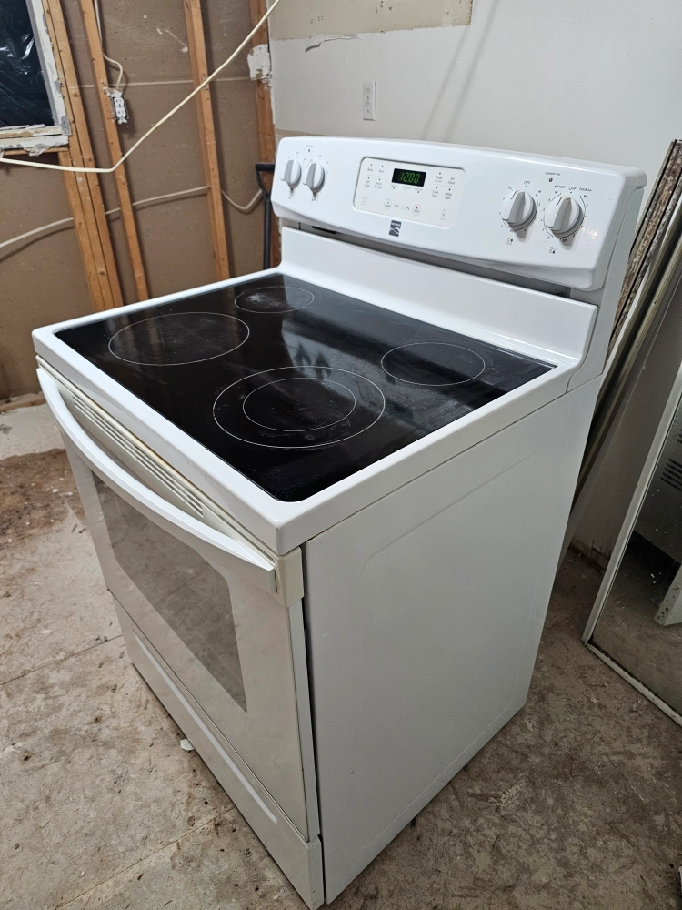 Kenmore electric range in white. It has a smooth top with four heating elements and a self-cleaning oven. Great for any kitchen!
