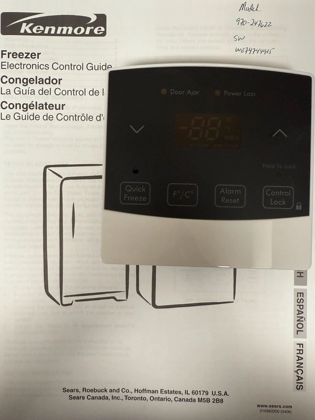 The front digital display for the Kenmore Upright Freezer, Model: 970-247622. Display Board works excellent. Brand new Thermistor included.