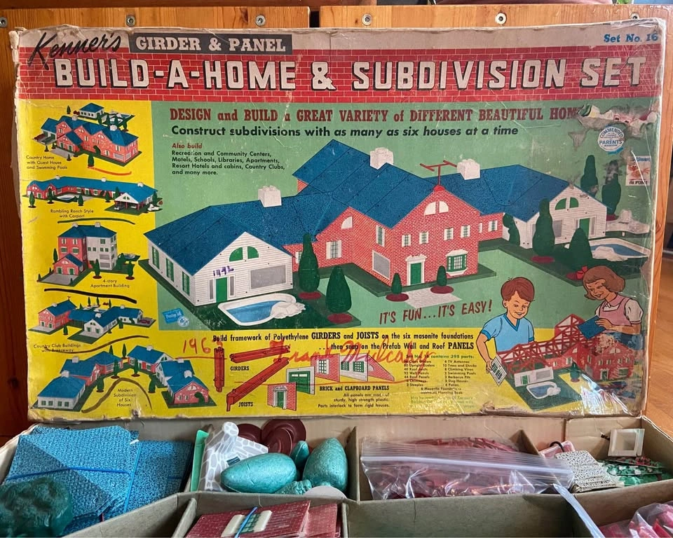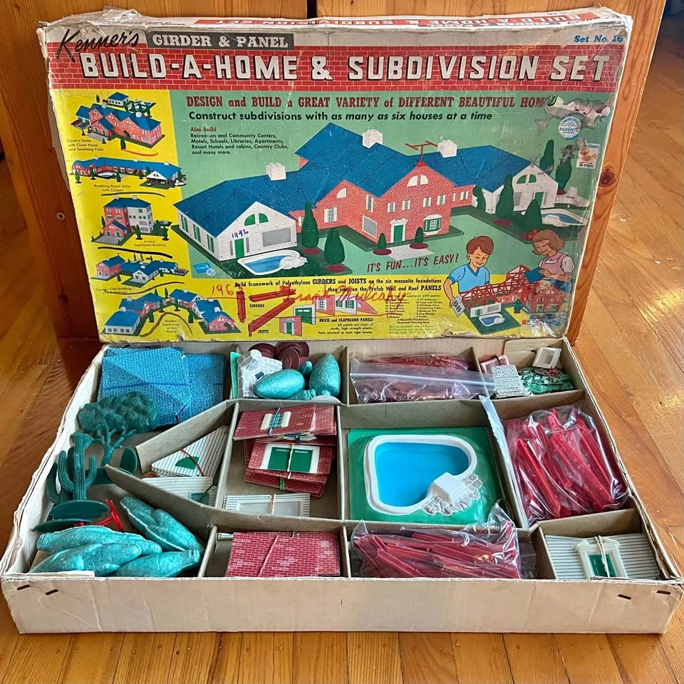 10Kenner's Girder and Panel 1962 Build-A-Home & Subdivision Set No. 16 410pcs-ish. Near complete. The planning manual is included but the pages are loose. Box/Manual have heavy wear, Contents are Good, pieces mostly there. As-is. As new subdivisions started to spring up around cities beginning in the 1950s and after, Kenner Toys reflected the trend in their Build-A-Home Building sets. The Build-A-Home sets enabled children to construct modern suburban homes, with simulated brickwork or white clapboard siding. New diagonal beams called joists were introduced to permit a low angle pitched roof to be built, and covered with vacuformed plastic roof plates. Styles varied between brick or white vinyl siding. Patios, swimming pools, TV antennas, steeples, chimneys, barbecues, and doghouses were all added as accessories to decorate the home. Molded green polystyrene foam trees along with vacuformed shrubs and vines also provided some crude landscaping. The best set of the group was the #16. There were no motors or roadway pieces in this group.