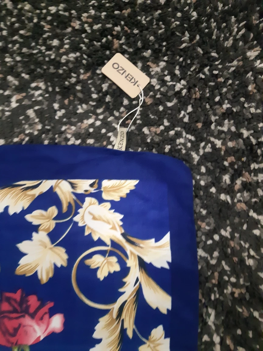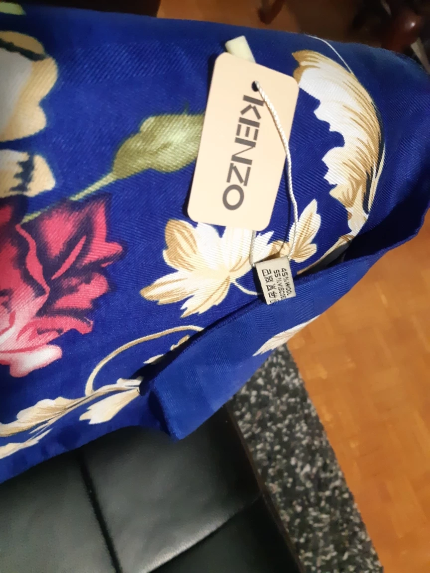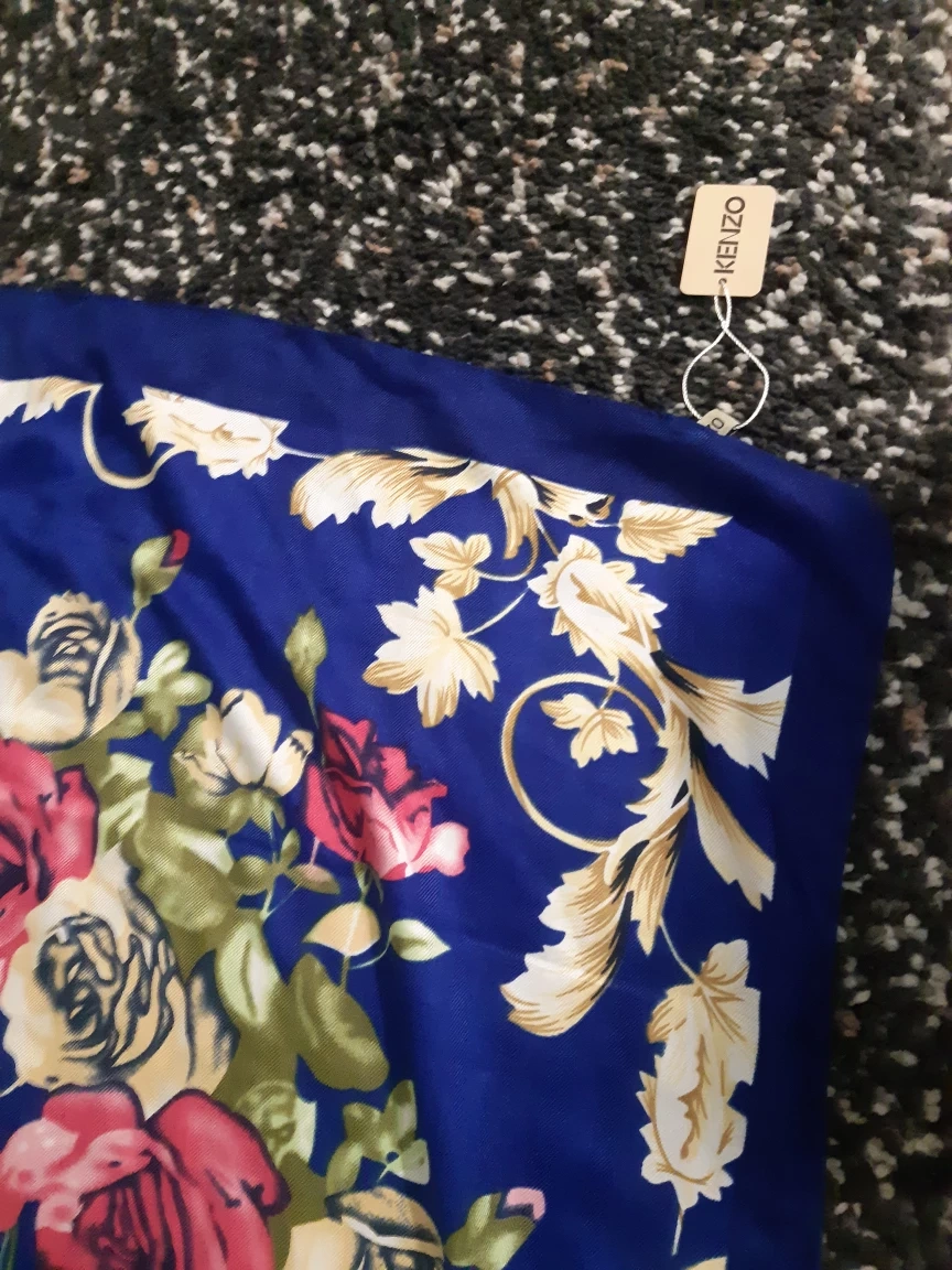 101Beautiful Kenzo scarf. Features a vibrant blue background with a floral pattern. Soft and luxurious feel. Perfect for adding a touch of elegance to any outfit.