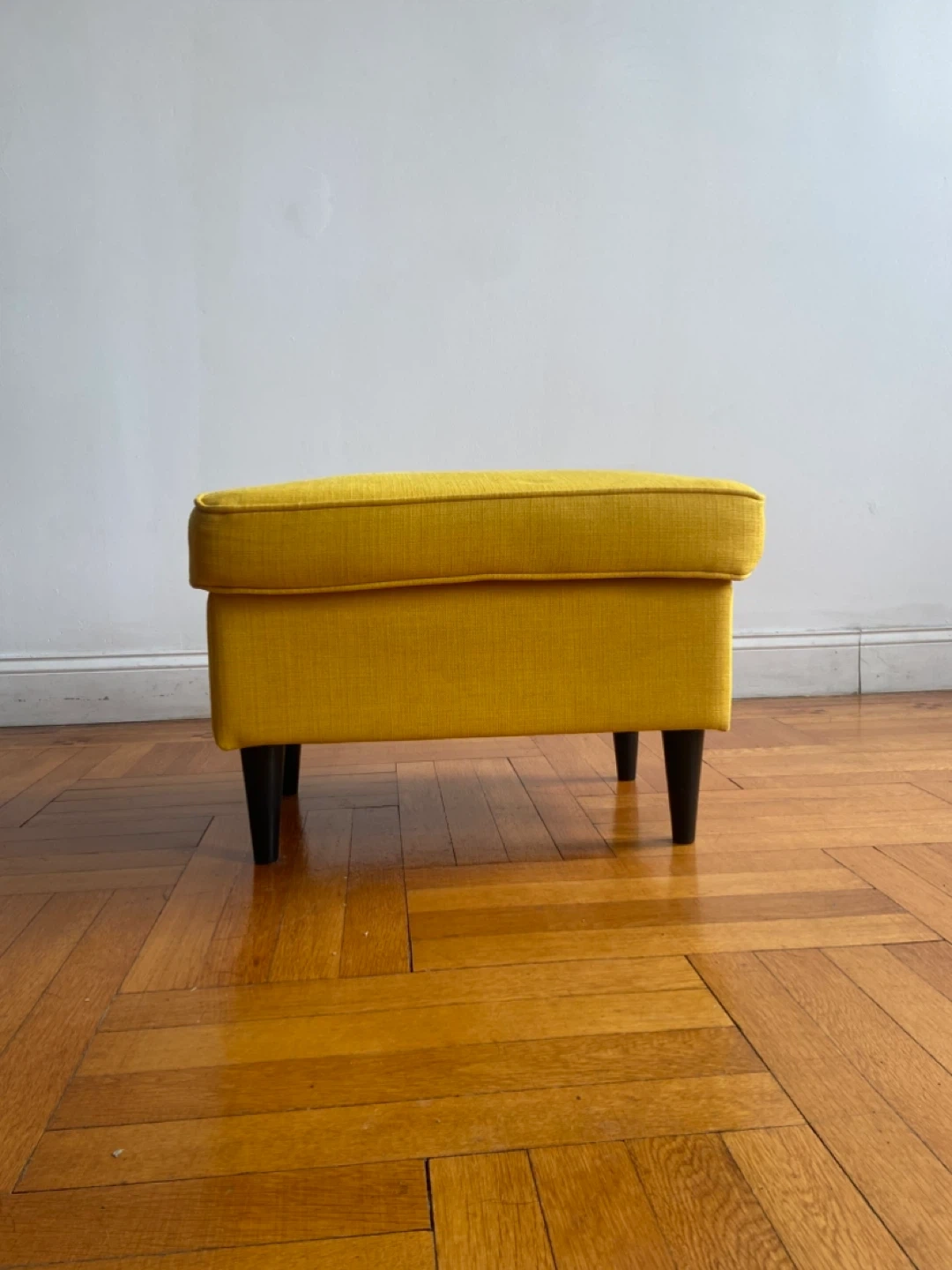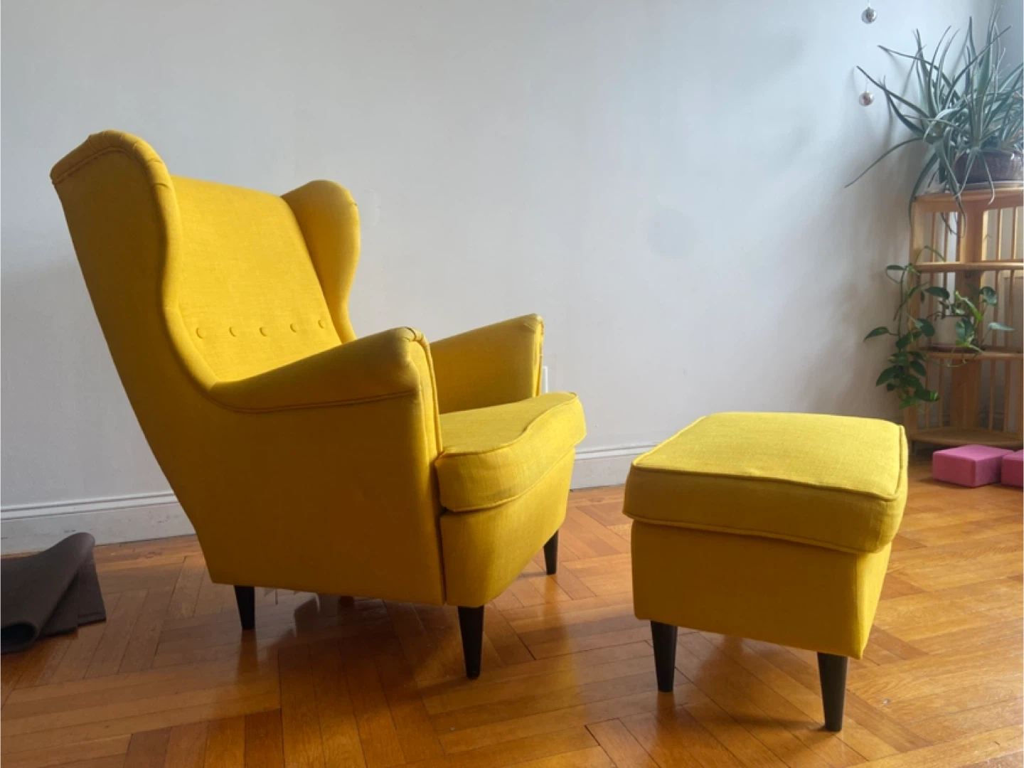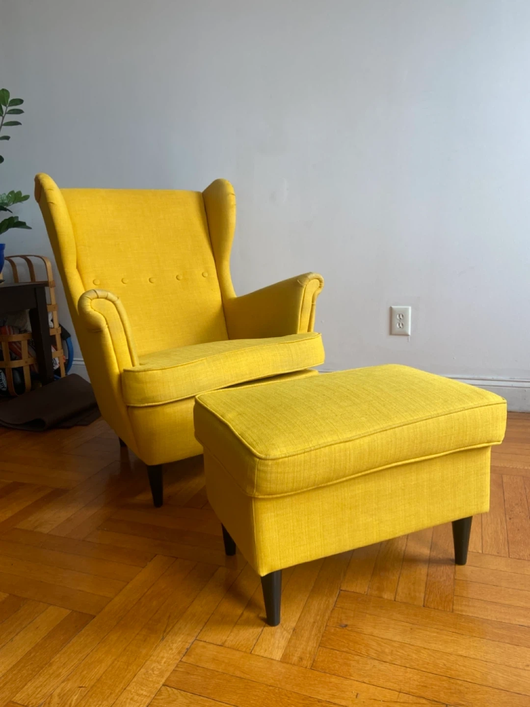 Ikea yellow upholstered wingback armchair with a matching ottoman. The set features button tufting on the backrest and tapered wooden legs. This comfortable chair and footrest combo is ready to brighten up your living space!