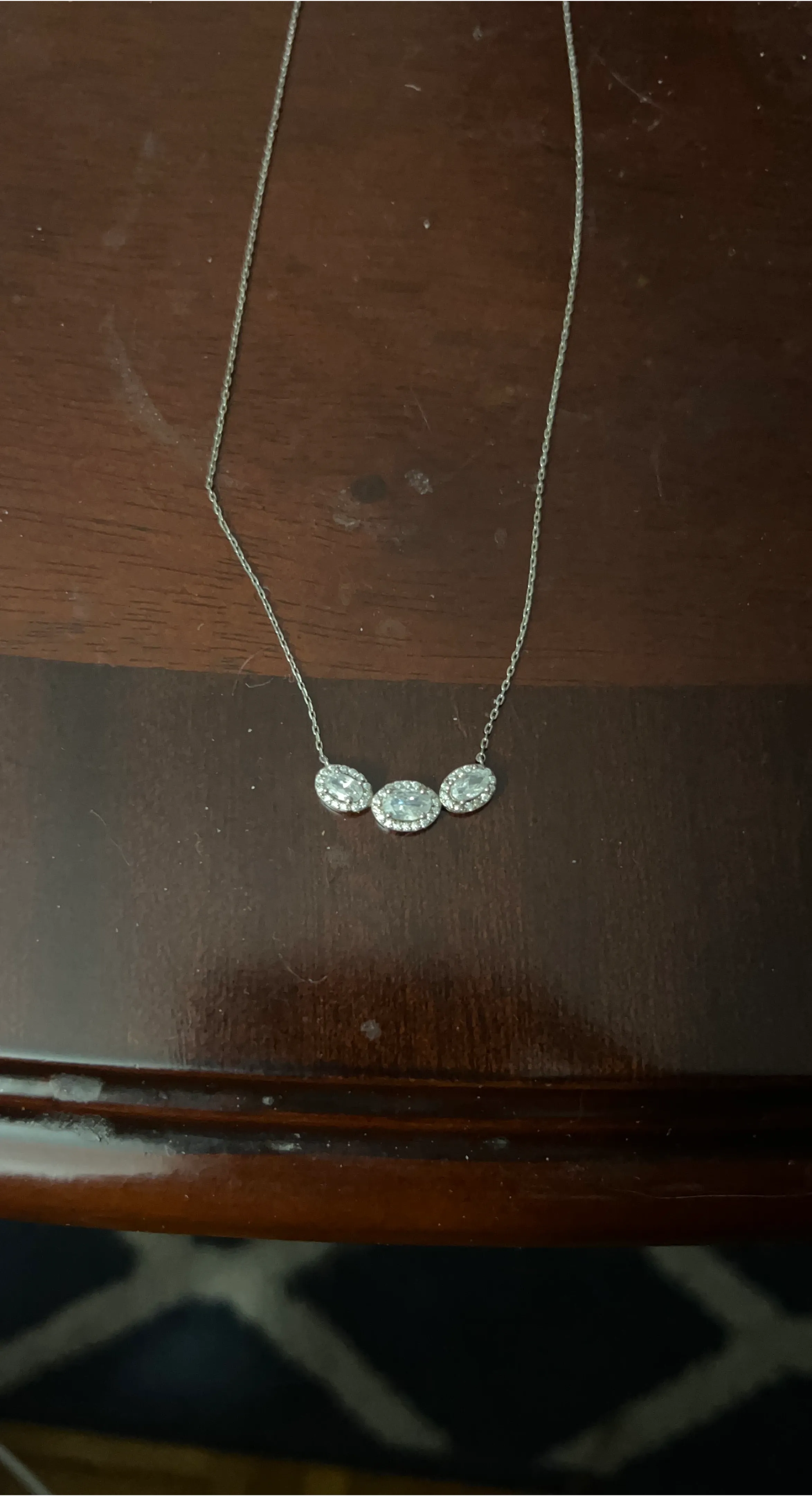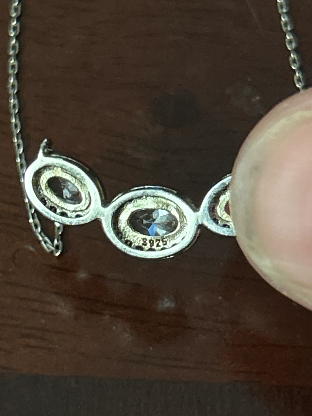 This silver necklace features three oval-shaped crystals set in a line. The metal is marked "S925" indicating sterling silver. It's a classic piece for everyday wear or special occasions.