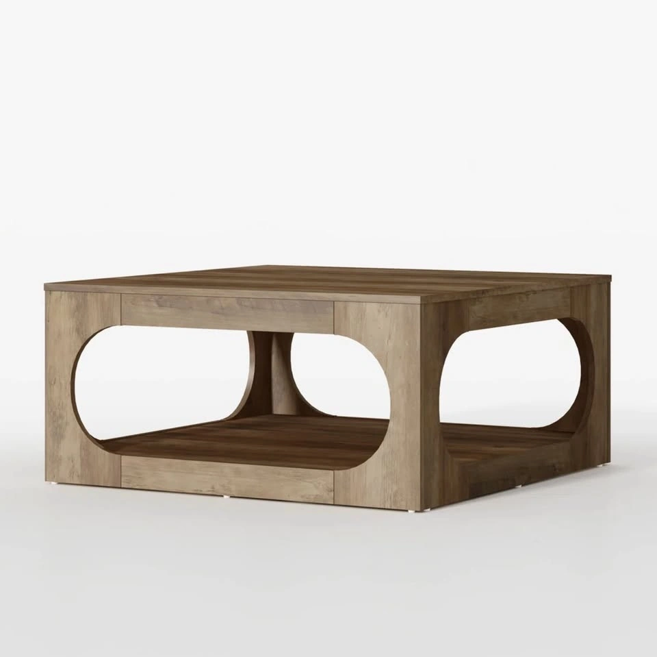 The table has a unique modern design with oval cutouts on the sides and a lower storage shelf, making it both stylish and functional for a living room.
