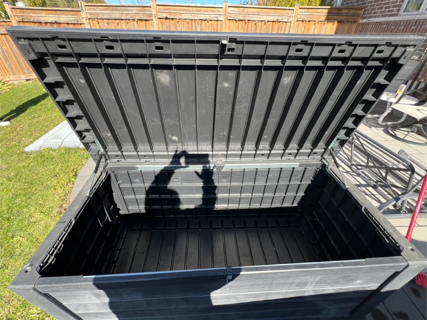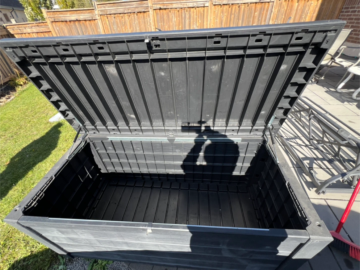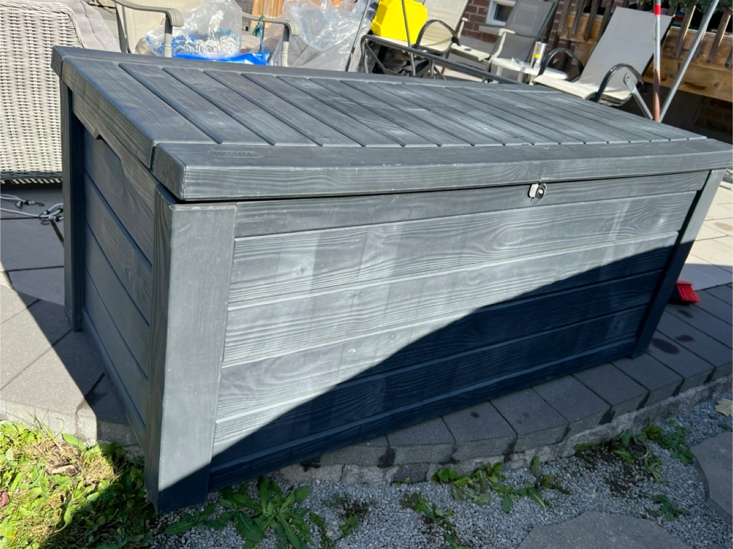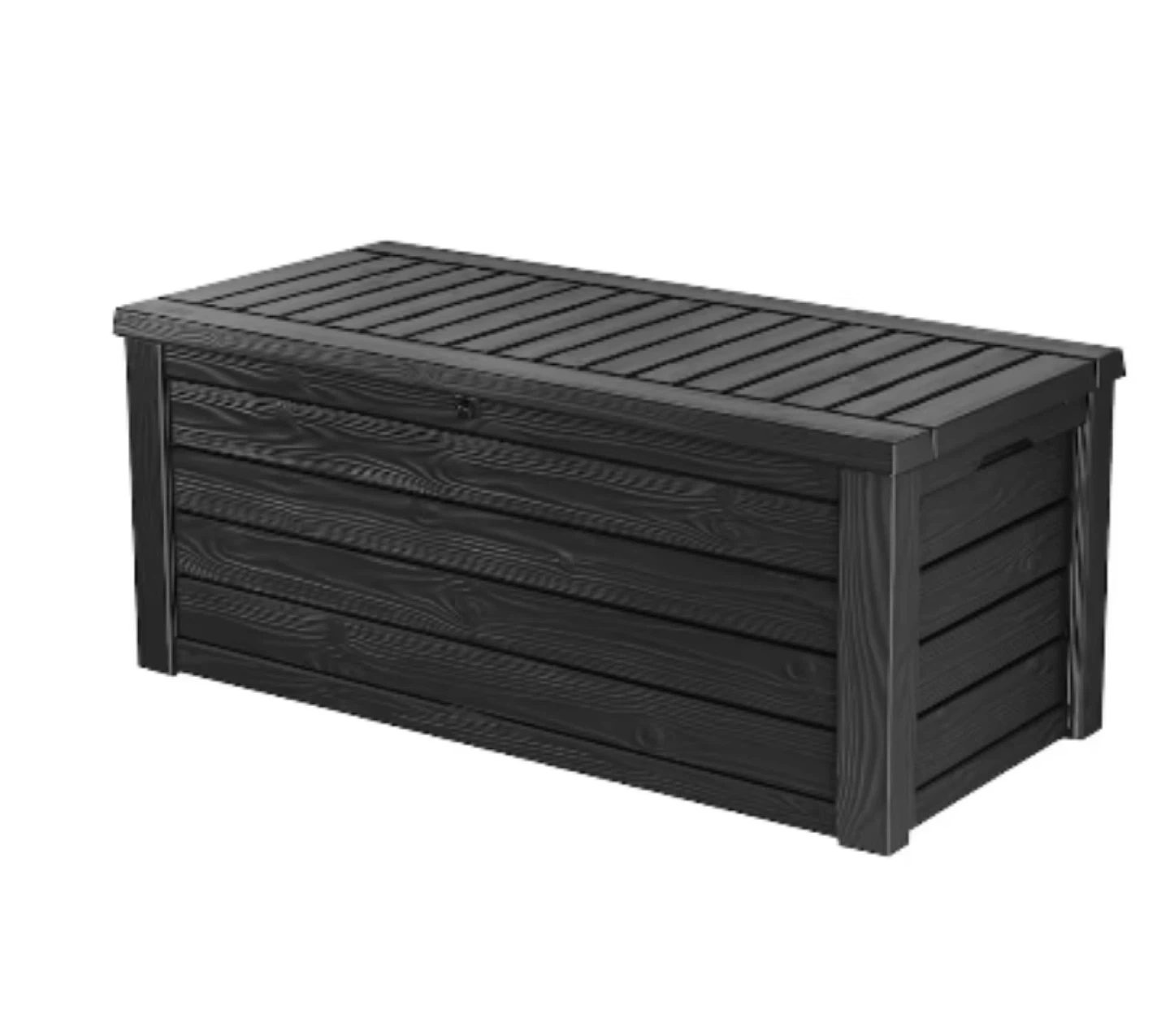 108This Keter lockable storage deck box is perfect for storing your outdoor essentials! It has a 150-gallon capacity, so you can fit a lot inside. The box is made of durable resin and has a wood-like texture. It is in good condition and ready for a new home