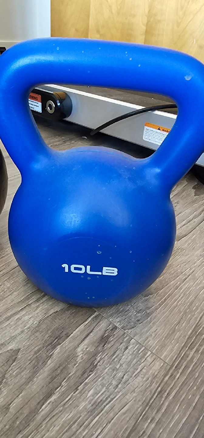 202Selling two kettlebells! One is black and the other is a vibrant blue. The blue one is marked as 10lbs. Great for home workouts and building strength