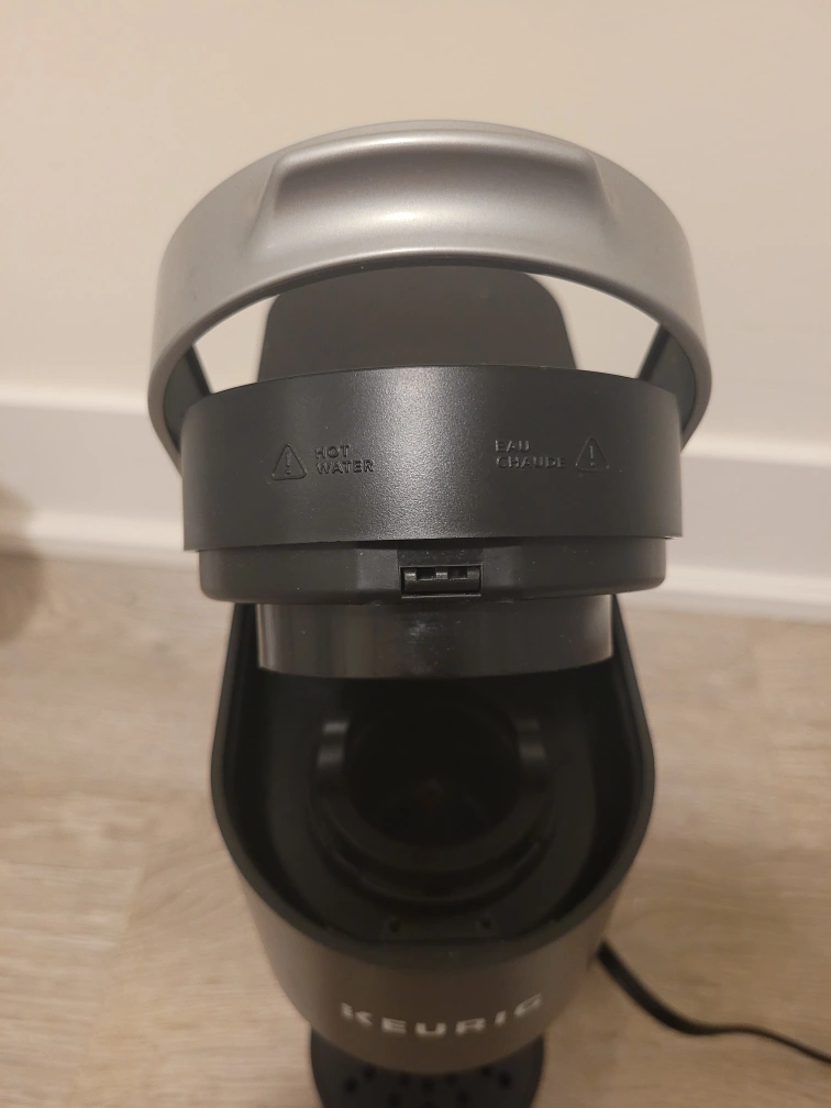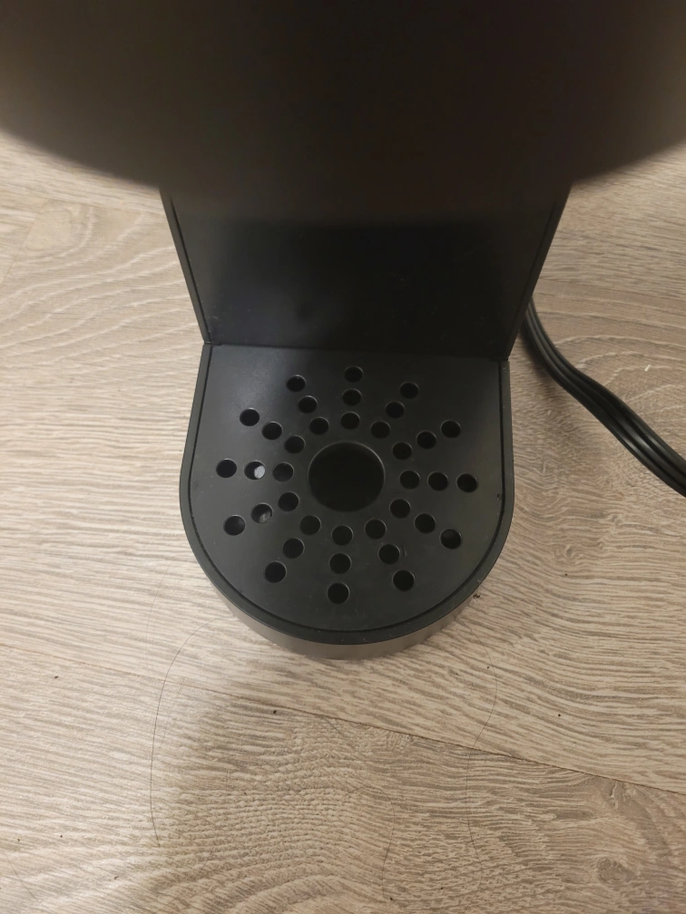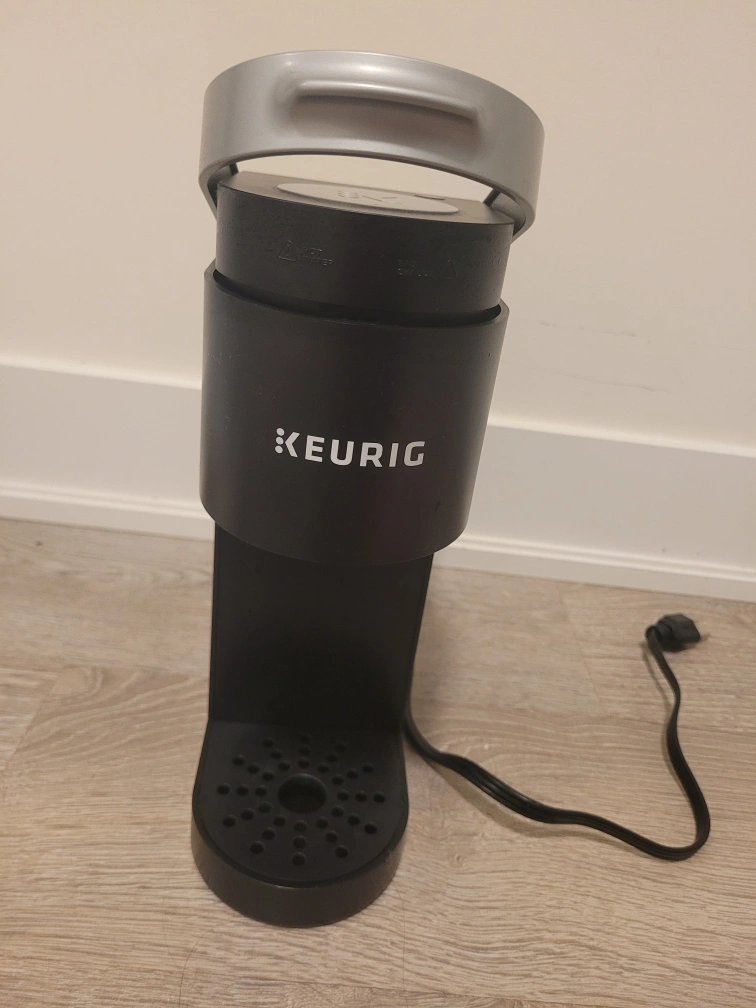 28A single-serve coffee maker. The unit appears black. Features a silver handle at the top. The base has a drip tray. Making yourself a hot beverage with this can be a great way to start your day peacefully.