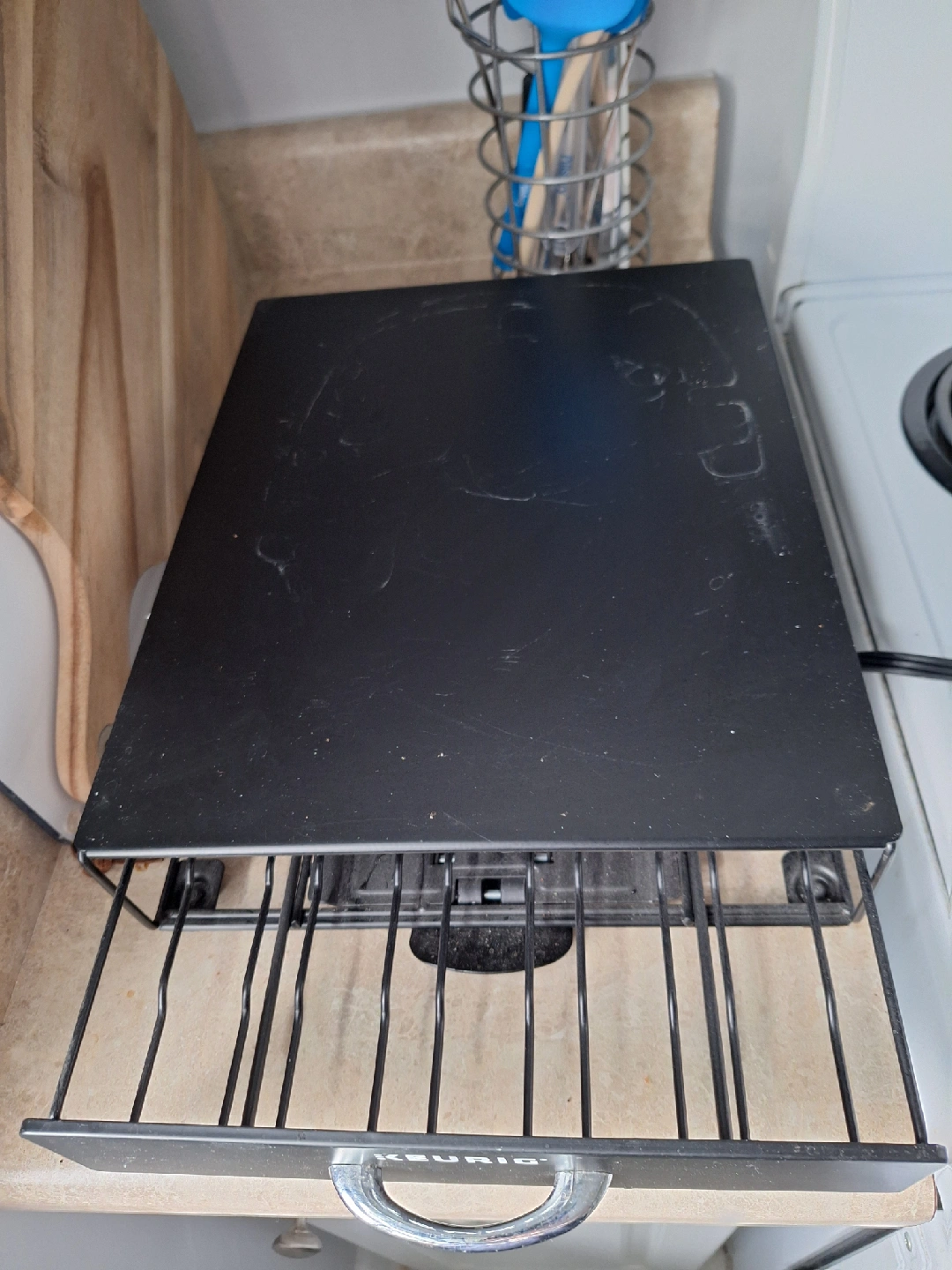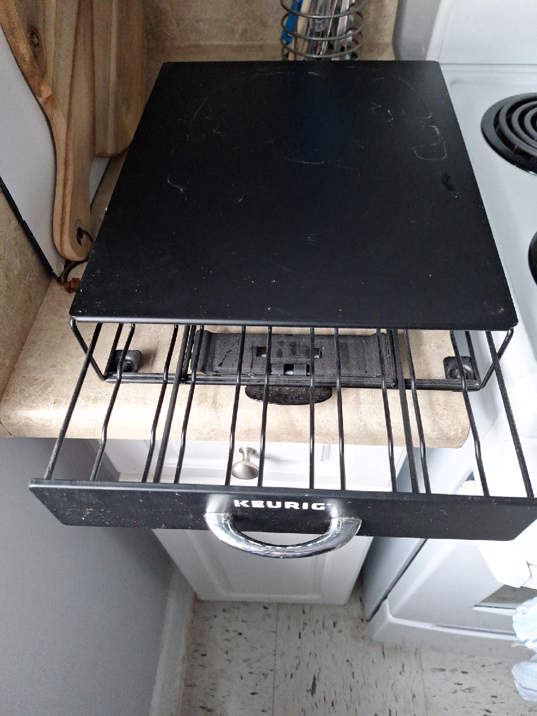 Keep your favourite K-Cup pods neatly organized with this Keurig storage drawer! It's in good condition and ready to find a new home in your kitchen. Perfect for keeping your counter tidy and your coffee selection easily accessible. Can hold up to 35 K-cups.