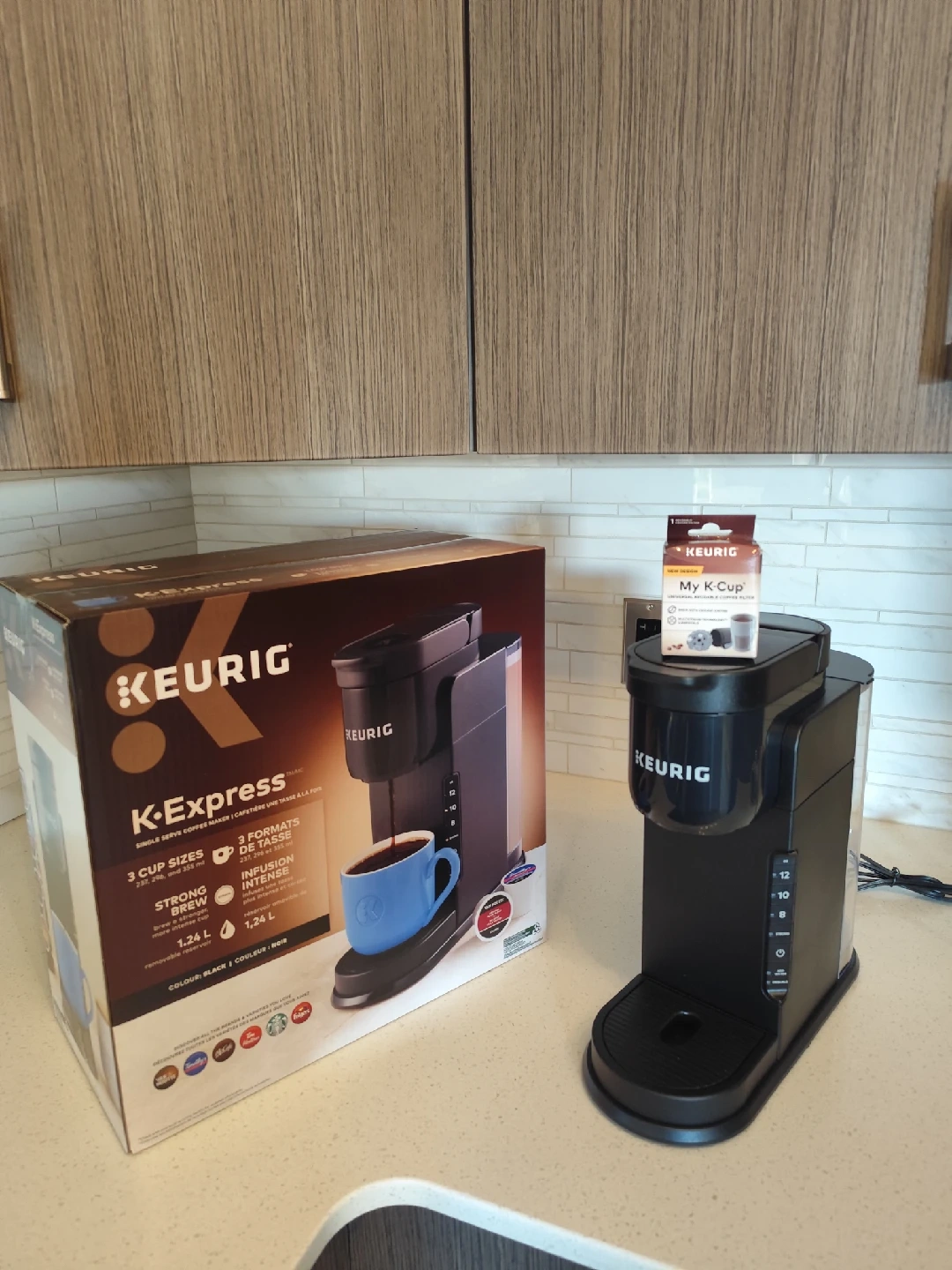 12Selling a Keurig K-Express single serve coffee maker in black! It can make 3 cup sizes: 237, 296, and 355ml. It also has a strong brew option and a 1.24 L removable reservoir, and a universal reusable coffee filter.The box is included!