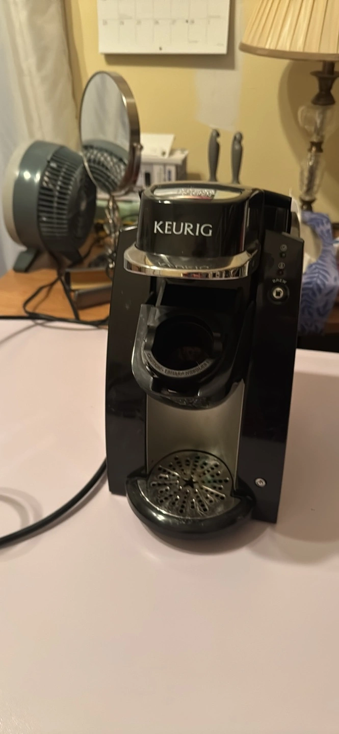 5Black and silver single-serve coffee maker. Compact design. Brew button. Used condition. Smoke free home