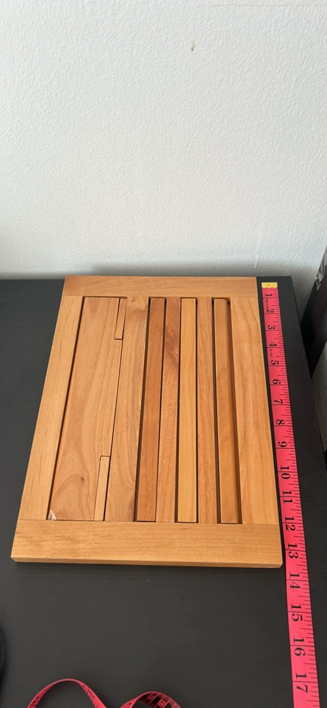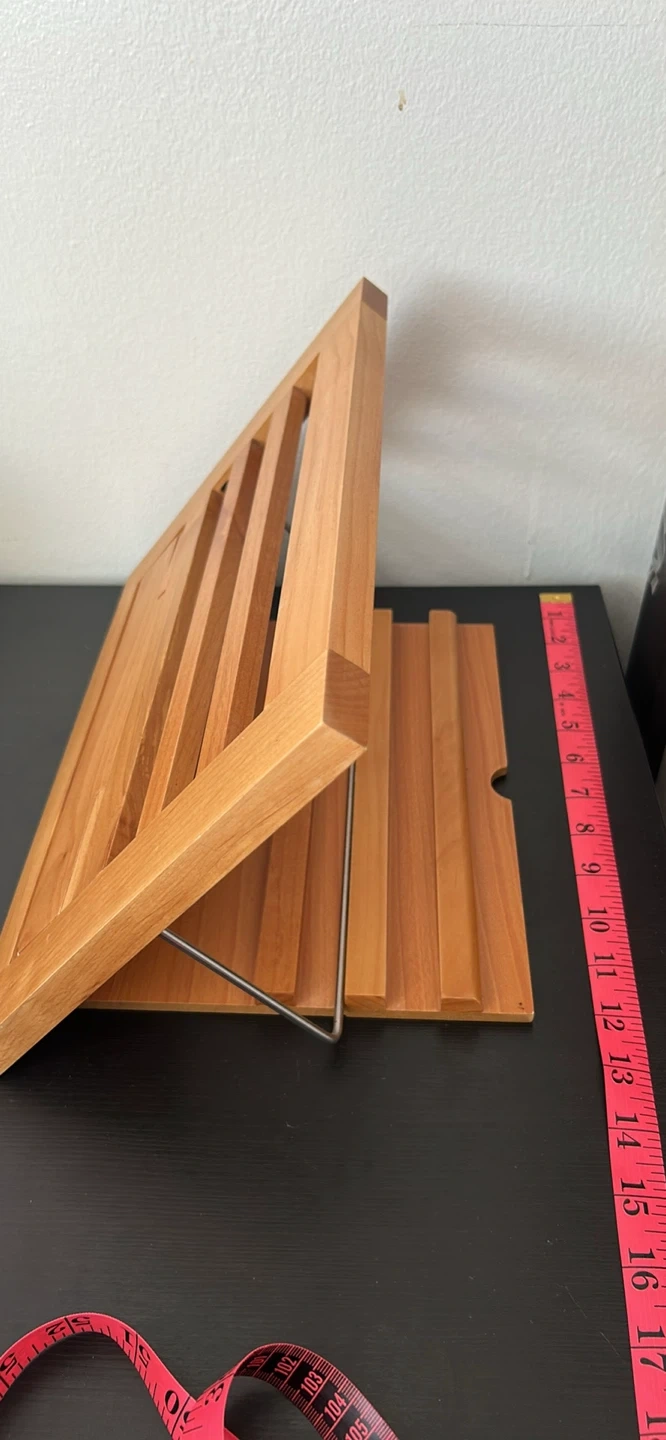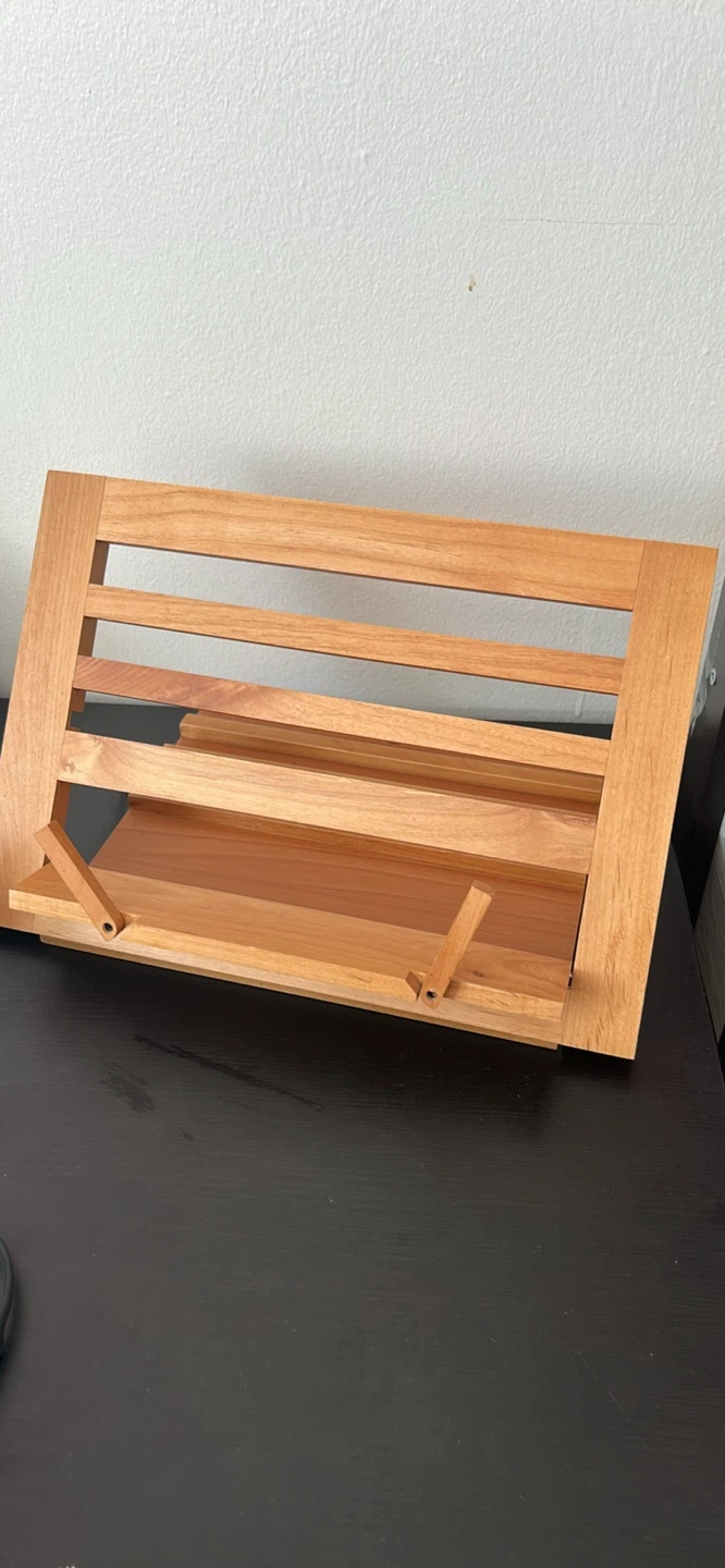 This wooden stand is perfect for holding cookbooks or recipes while you're cooking. It's made of wood and has a natural finish. The stand is adjustable for different viewing angles.