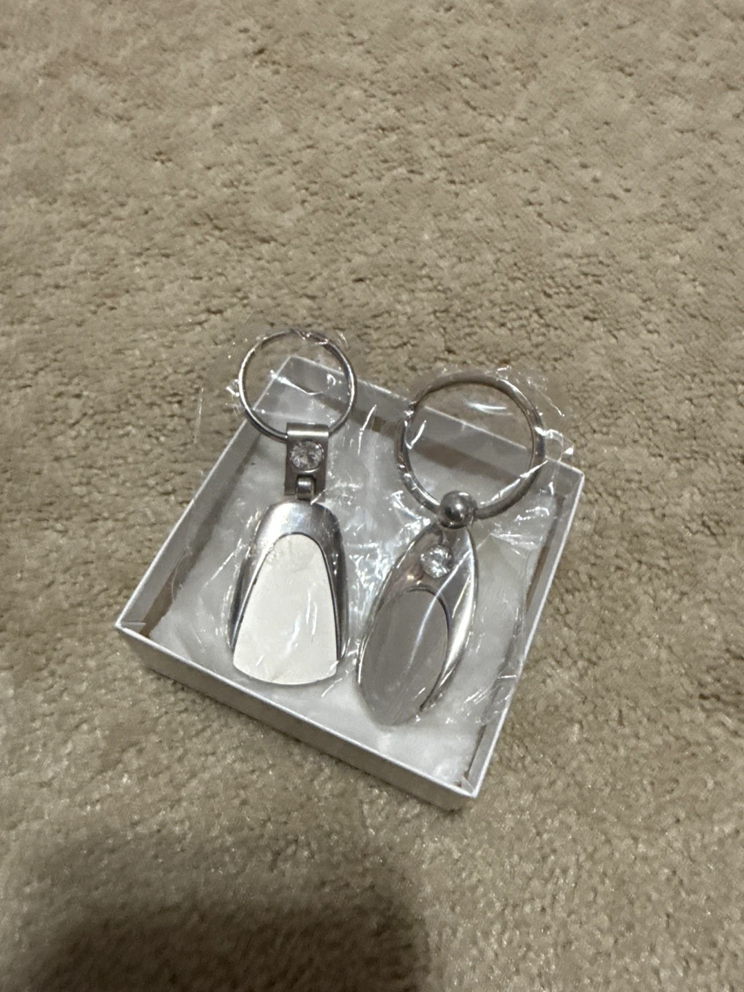 Selling a set of two keychains, still brand new in their original box! They have a nice silver tone and a simple, elegant design. Perfect for couples or as a small gift